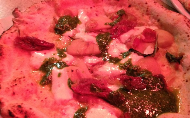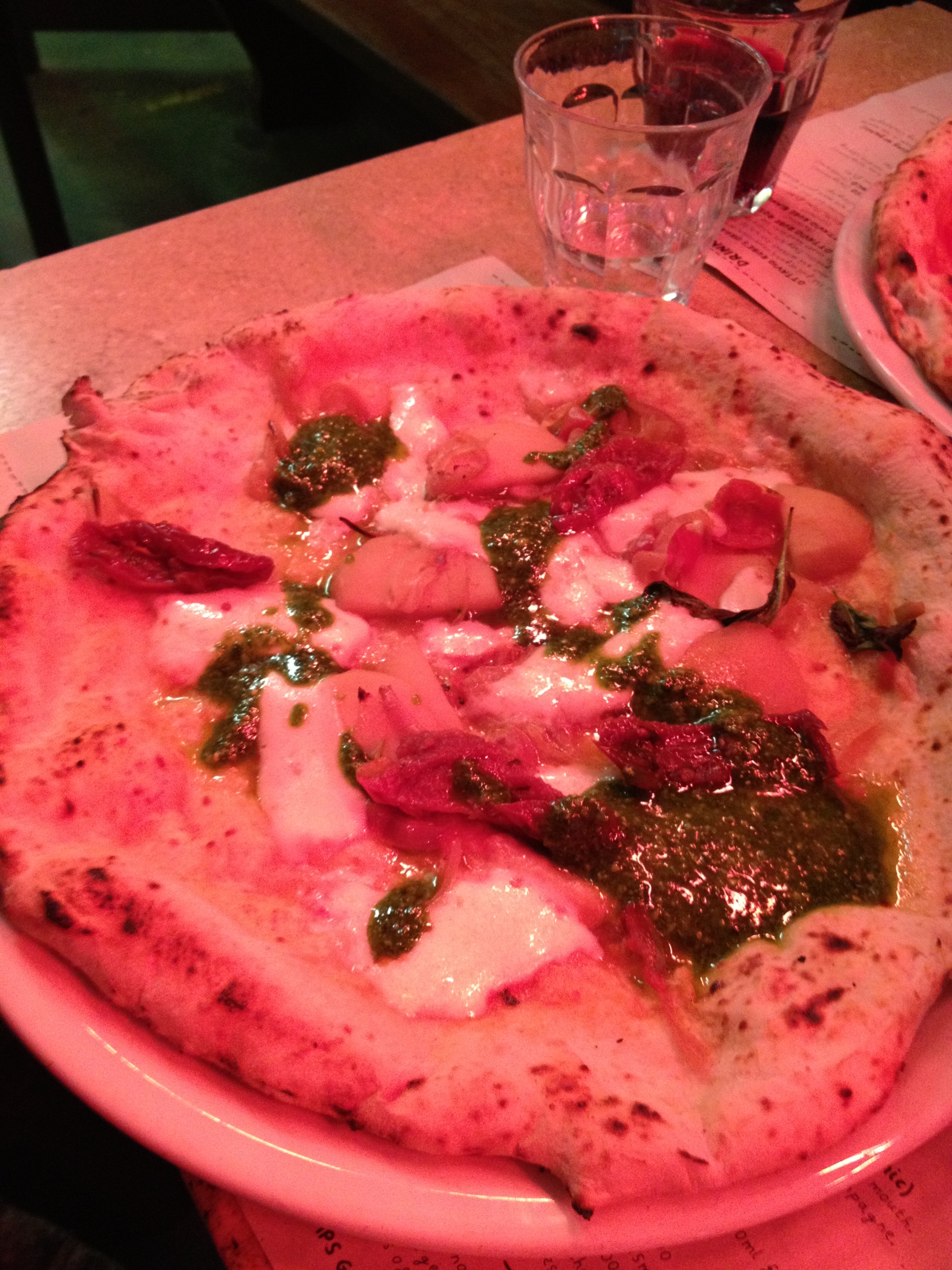 Luckily, it was. I was struck by the simplicity of the menu. There were six pizzas to choose from and two “specials” (one vegetarian and one meat). Amazingly (for London, anyway) all of the pizzas were under £10. I ordered the special pizza, which had slow cooked lamb on top. Fortunately, for me, the pizzas arrived extremely quickly and I was simply not prepared for how good they were going to be. The pizzas are cooked on a slow-rising sour-dough base, which is given at least 20 hours to develop which is cooked in a brick oven that was constructed by specially designed by artisans in Naples. They claim that the oven can get to the heady heights of 500°C. The result of this cooking process is that it produces a “crust” or “cornicione” that is lovely, light and soft. The restaurant is very particular about their ingredients; the menu and website both explain exactly where the cheese, tomatoes and meat are all sourced from. You immediately get the distinct feeling that they care deeply about the quality and the heritage of their ingredients and products. A picture of the delicious vegetarian special (featuring potatoes and green pesto) is shown below: