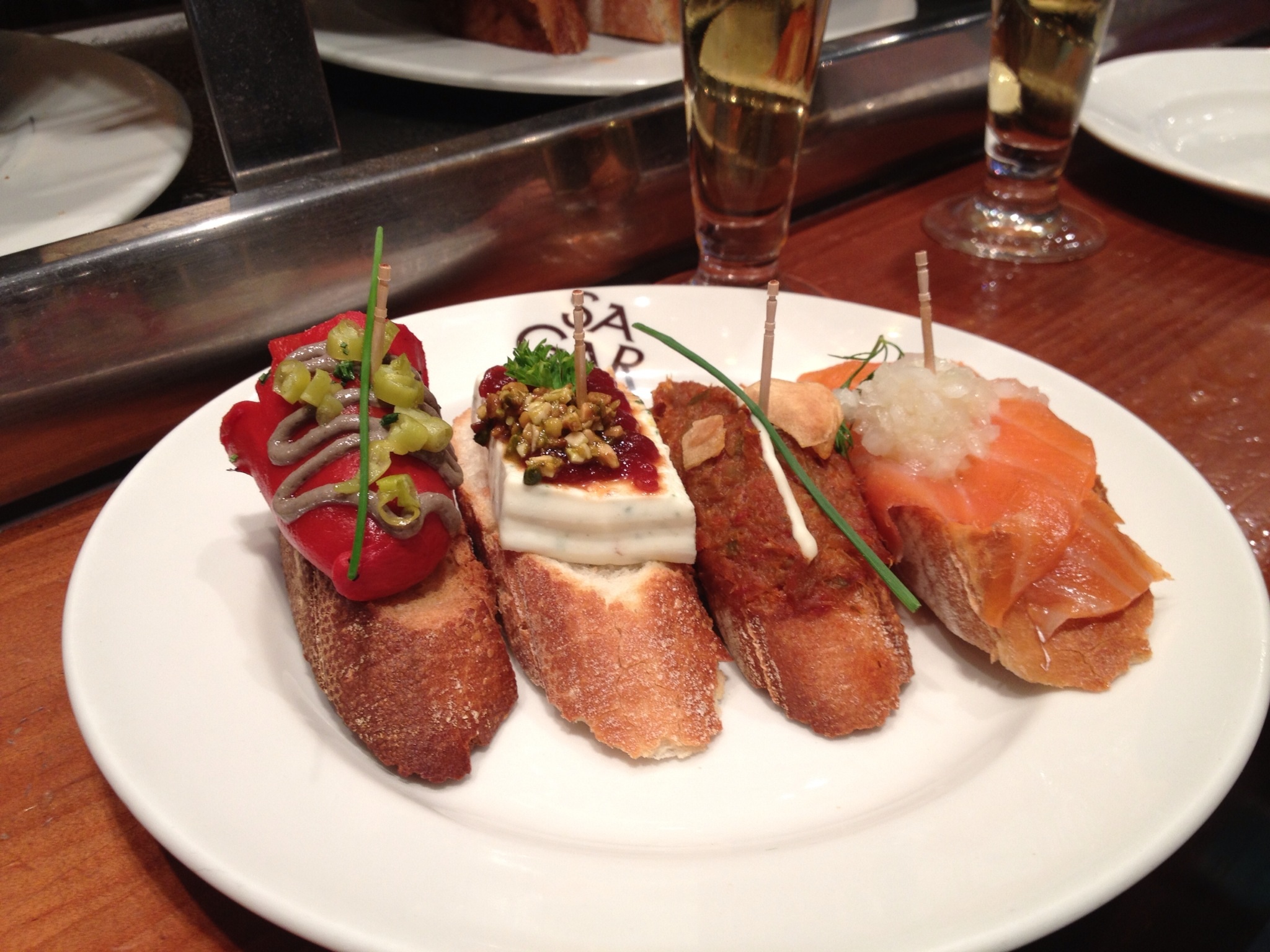 When we were in Valencia we took the opportunity to visit a couple of much-vaunted tapas bars, both of which were in the old town and I would highly recommend. Firstly, we went to Sagardi (http://www.sagardi.com/restaurantes/34/sagardi-valencia-centro) where they feature pinxtos, which are delightful little sandwiches on a cocktail stick – each costing a mere €1.95 each. Below are a selection that we tried, featuring: Dolce Latte with Damson Jam and Walnuts, Tuna with Tomato, Paprika and Pimento, a Stuffed Pepper with a tuna and anchovy paste filling, Smoked Salmon and Coleslaw: