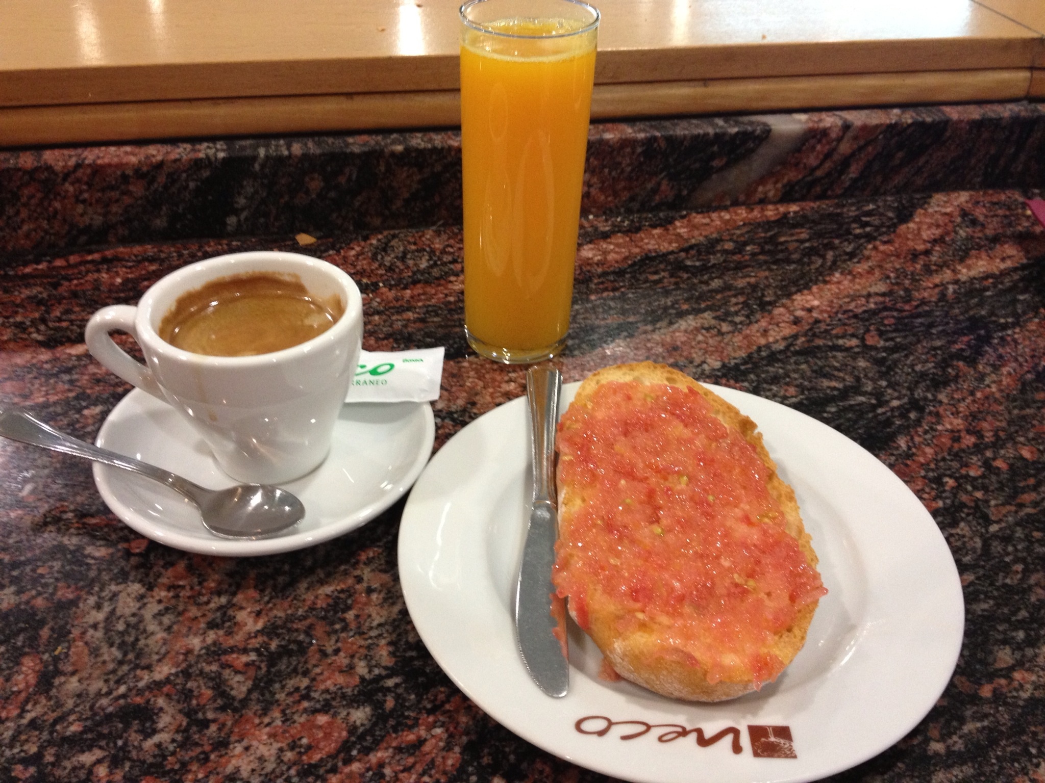 We discovered an exceedingly simple, but truly memorable breakfast option whilst in Valencia. This consisted of a tostada (a slice of toasted rustic bread covered with olive oil and freshly made tomato pulp), coffee and freshly squeezed orange juice: