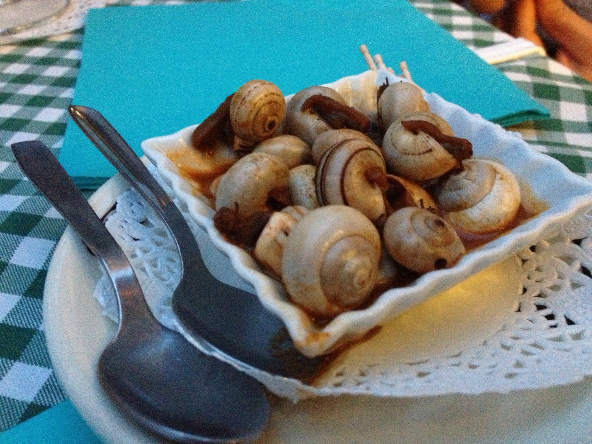 In another restaurant (where we went to eat Paella predominantly, see below), we were given a charming little plate of the most delicious snails that I’ve ever eaten. They were served in a slightly spicy, but very tasty, broth: