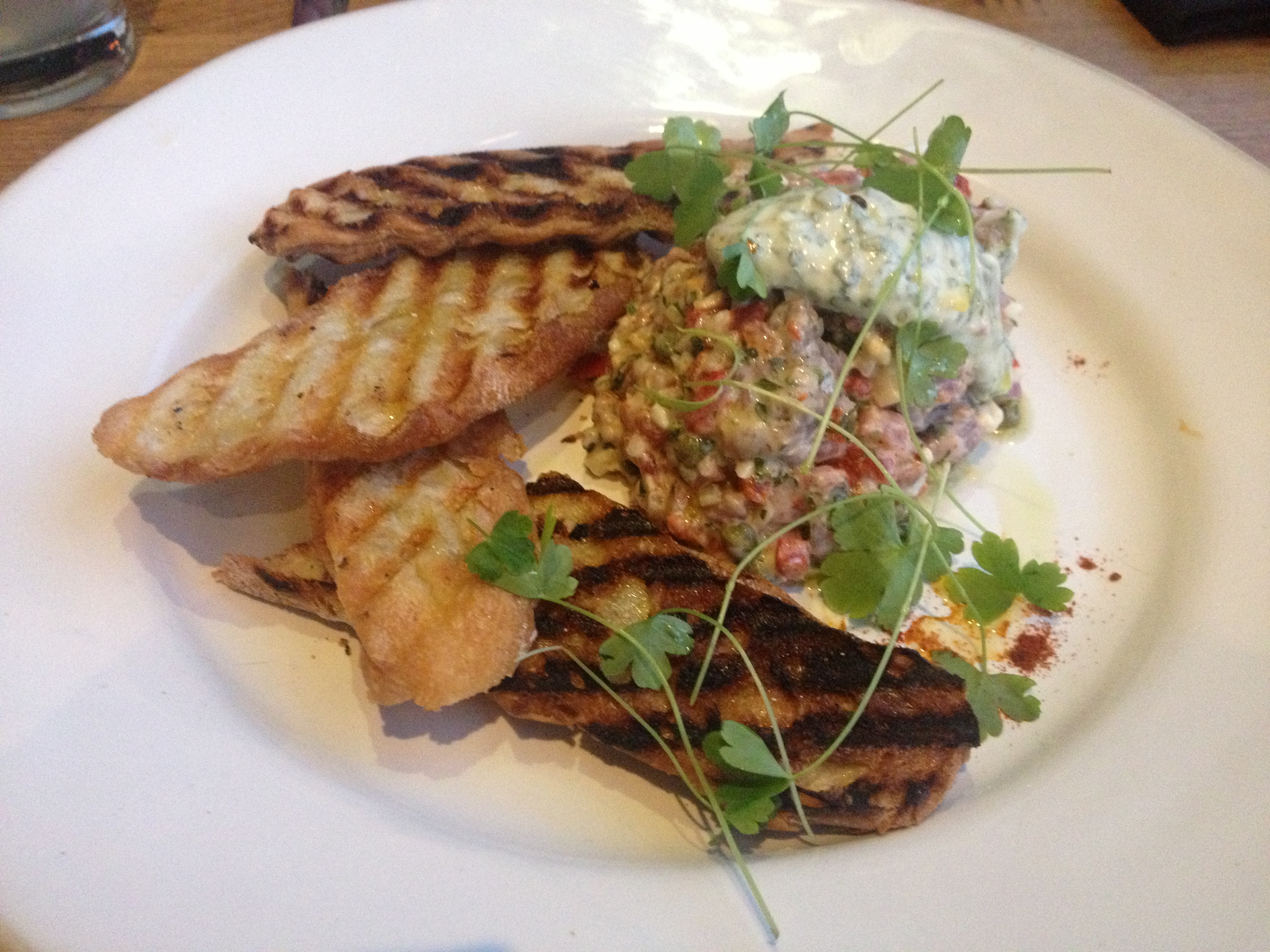 For starter we shared what turned out to be the highlight of our dinner – a fillet of Beef Tartare with Chimichurri Aioli, Charred Red Peppers and a Hard Boiled Egg. The quality of the meat was immediately apparent, it was succulent and tender and beautifully seasoned. The accompanying elements made sure that there were lots of interesting flavours to combine the raw meat with. It also came with some deliciously toasted crostinis. We were seriously impressed with this dish. It was on their “Sharing Plate” menu and was a perfect size for two people to share as a starter.