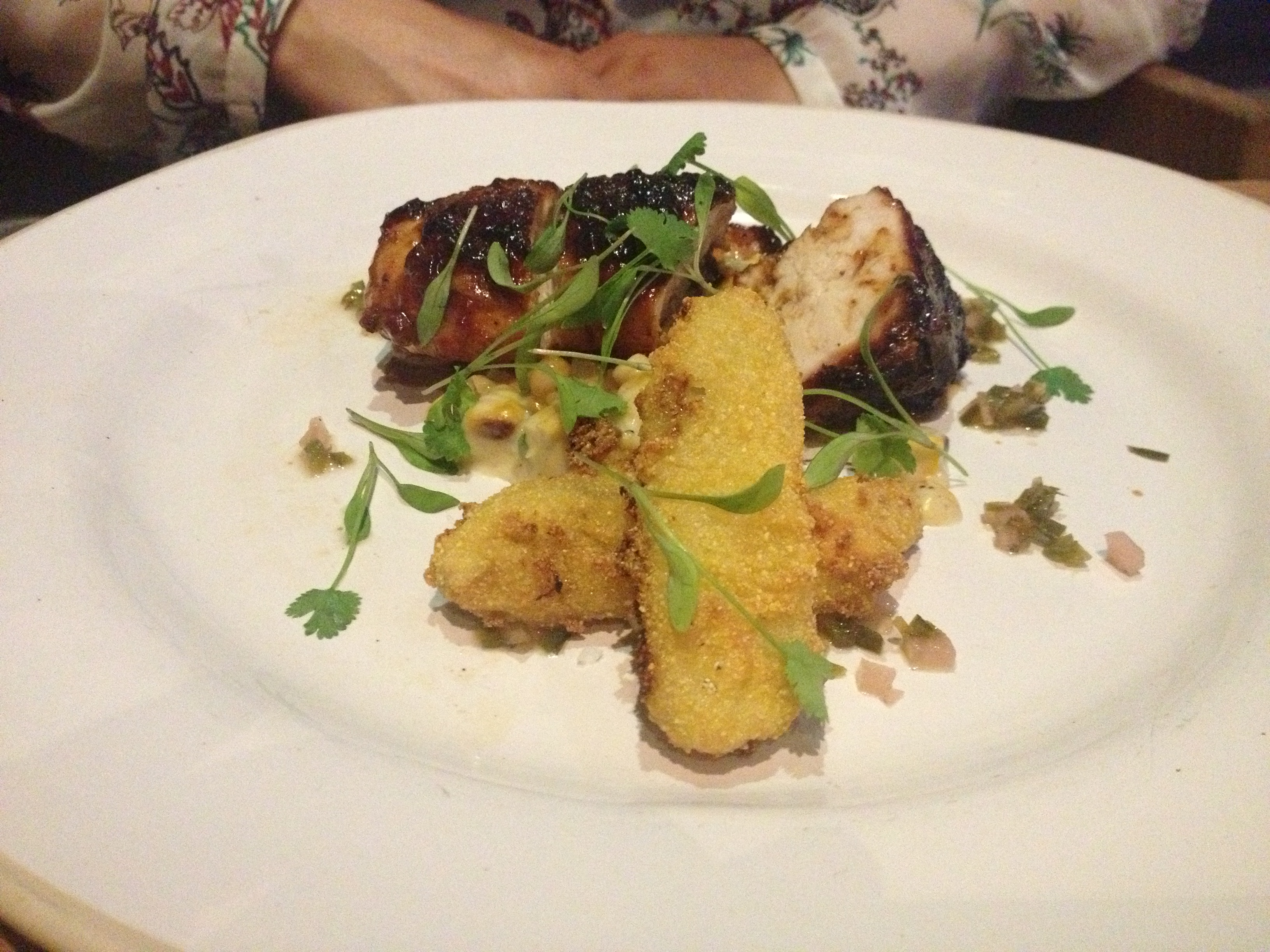 My wife chose for her main the Brined and Roasted Chicken Breast which was served with blackened creamy corn, deep-fried banana and Jalapeño Salsa. As you can see from the photo below, it was extremely attractively presented. The chicken breast itself was beautifully succulent and the glaze that had been applied to the outside gave it a lovely, sticky coating. It’s probably an appropriate time for me to admit that there is only one food on this planet that I have encountered so far that I absolutely will never eat – bananas. Now is not the time to explain why, but suffice to say they are evil and an abomination. That being said, my wife was rather pleased with her deep-fried banana as an accompaniment to her chicken.