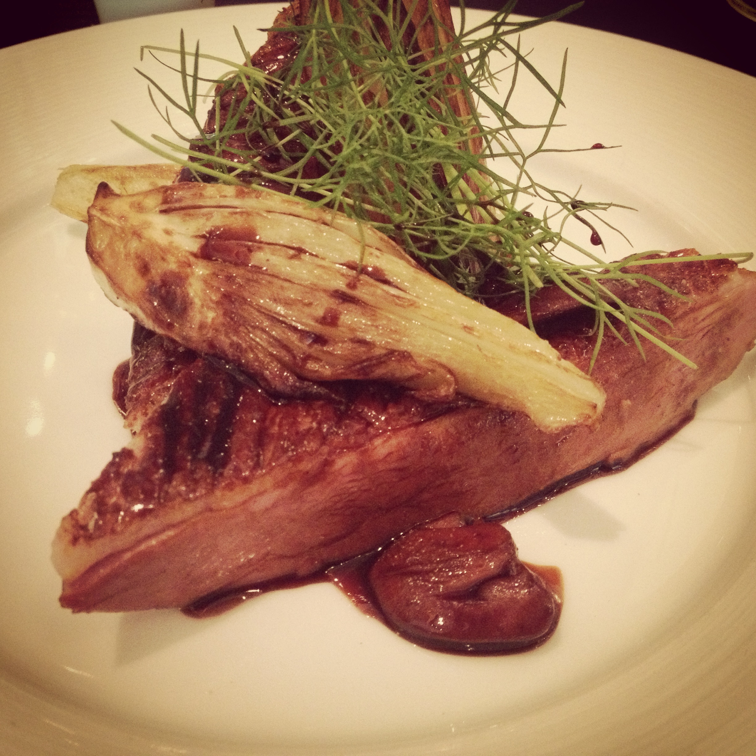 For the main courses, I again ordered well. I ordered the Powdered Duck Breast served with smoked confit fennel and umbles (origin c. 1670). The presentation was beautiful, with the elements stacked to give it an impressive height, with the umbles providing a nice colour contrast. The meat was, as you would expect, absolutely perfectly cooked and it came with an intensely reduced sauce that you could pour over the duck to add to the flavour-fest.