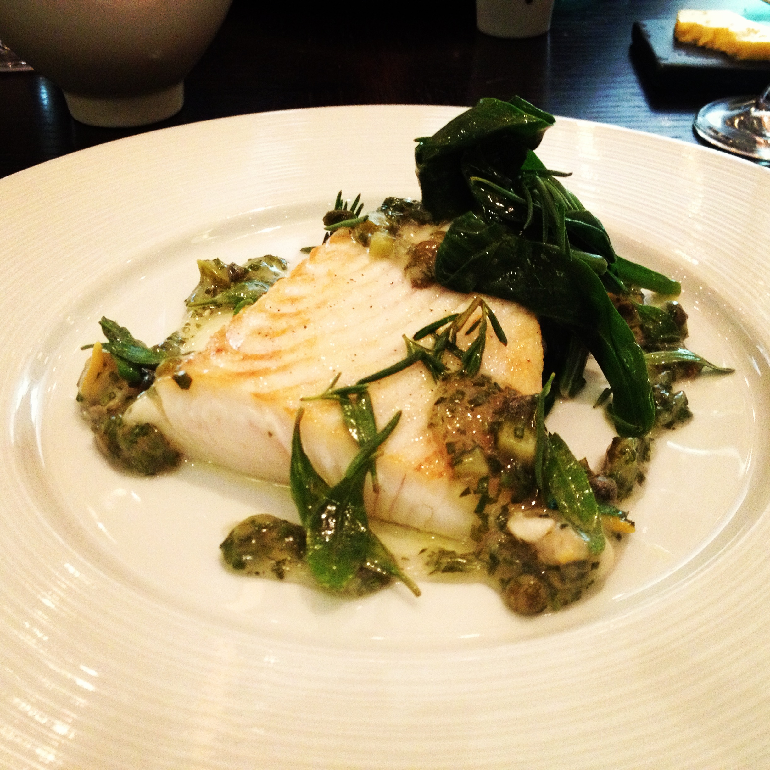 I ordered the restaurant’s signature starter – the Meat Fruit (origin c. 1500). This was a beautiful faux Mandarin (a clever hat-tip to the name of the hotel), which contained chicken liver and foie gras parfait and served with grilled bread. On cutting into the Mandarin a delicious, creamy and rich interior was revealed. It was a fairly sizeable portion as well, which allowed me to share some of it (not too much, mind!) with my wife who had decided against a starter. A gentleman next to me, who ordered after me, took the seemingly unusual step of ordering a glass of Sauternes to have with his; which on reflection looked like an inspired choice with the sweetness and acidity complimenting the creaminess and fattiness of the pate/foie gras combination. This was truly a memorable dish and is a signature of the restaurant for good reason.