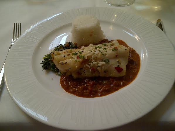 This was followed by a pan-seared whiting fillet served with a Keralan curry sauce and steamed rice. The fish was exceedingly tender and flaked easily with the fork and was complimented well with the spicy sauce.
