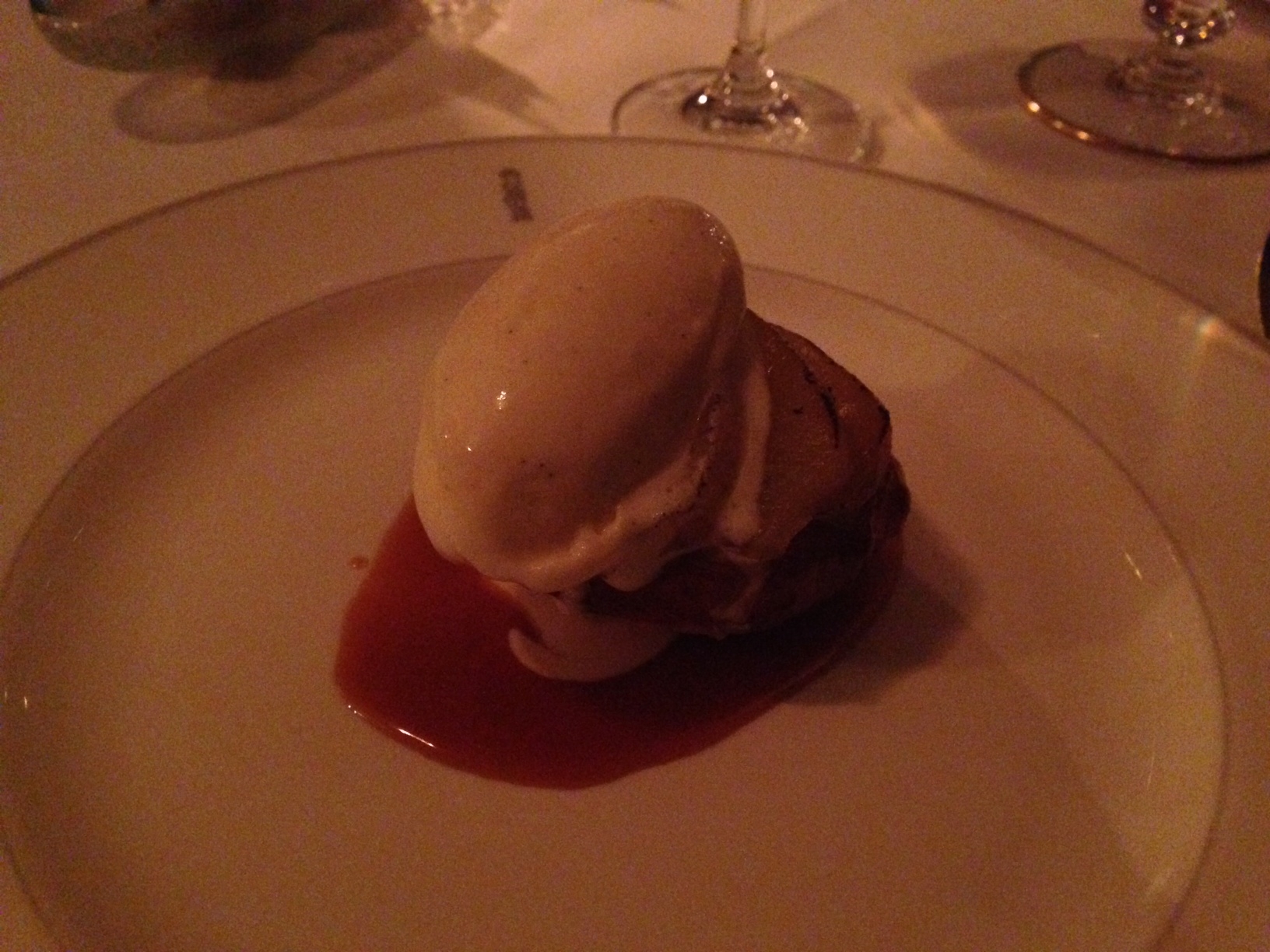 photo 12 Finally we came to the pudding course, a Petite Tarte Tatin aux Poires et Glace à la Vanille de Madagascar (Pear Tart Tatin with Vanilla Ice Cream). What better way to end a sumptuous French meal, then one of the great French desserts? This didn’t disappoint at all, the Tarte Tatin and the pear were sticky, gooey, sweet, sharp, utterly delicious and complimented well by the creamy vanilla ice cream. Pudding was served with a 2010 Blanc de Morgex Vin de Glace (Ice wine) “Chaudelune” from Cave de Morgex in Vallée d’Aoste, Italy. I’ve never had an Ice Wine from Italy before and this was very special, perfumed with lavender and honey and light-bodied and fresh on the mouth. It was sweet, but not sickly sweet, which allowed it to accompany the dessert beautifully.