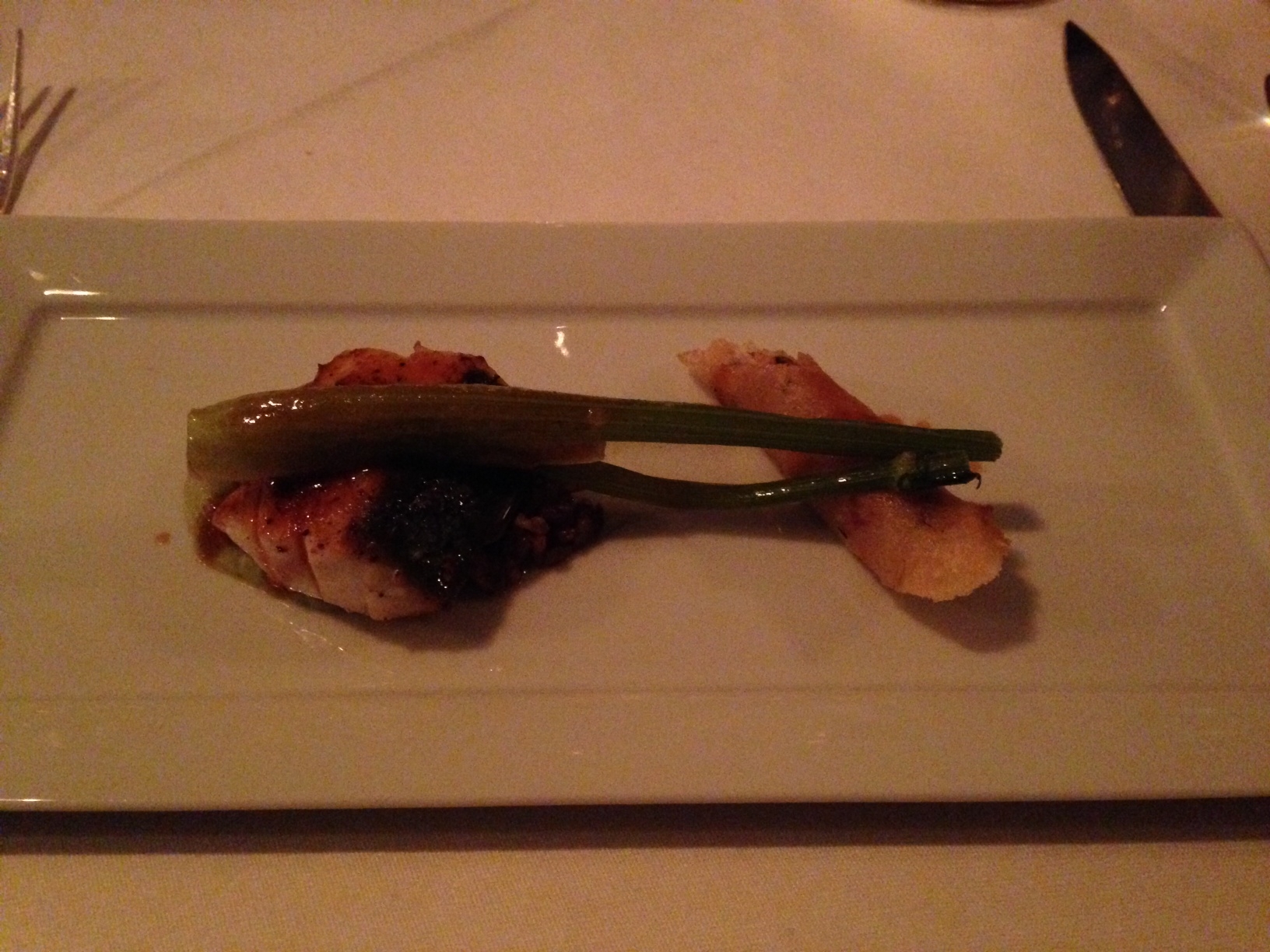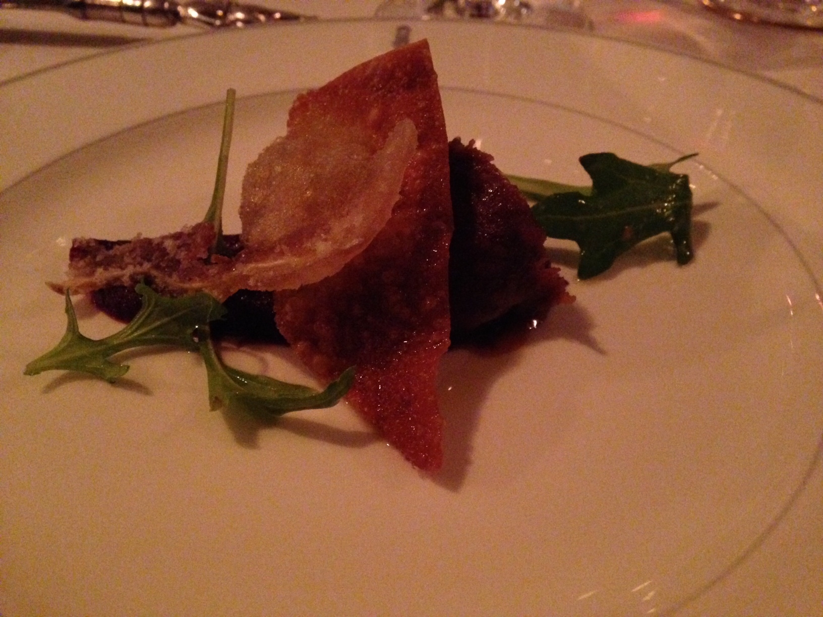 photo 6It was time for us to move on to the meat courses. We started with a Joue de Porc Braisée et Fumée, Cromesquis de Couennes (Braised and Smoked Pork Cheek, Crispy Belly Ravioli and Red Cabbage Condiment). The description alone tells you almost everything that you need to know about this dish; the pork cheek was deliciously tender and flavoursome, with the crispy ravioli of pork belly offering some textural variety. This dish was probably my favourite of the whole evening and was matched with a suitably glorious wine, a 2011 Morgon Côte du Py” from Domaine J. Foillard, Beaujolais. This was smokey, rich and complex on the nose, with a floral hint that was reminiscent of lillies. On the palate it transformed into something light and delicate, with strawberries coming through to balance well with the fatty and juicy pork. In terms of matching wine and food, this was what fine dining is all about for me – stunning.