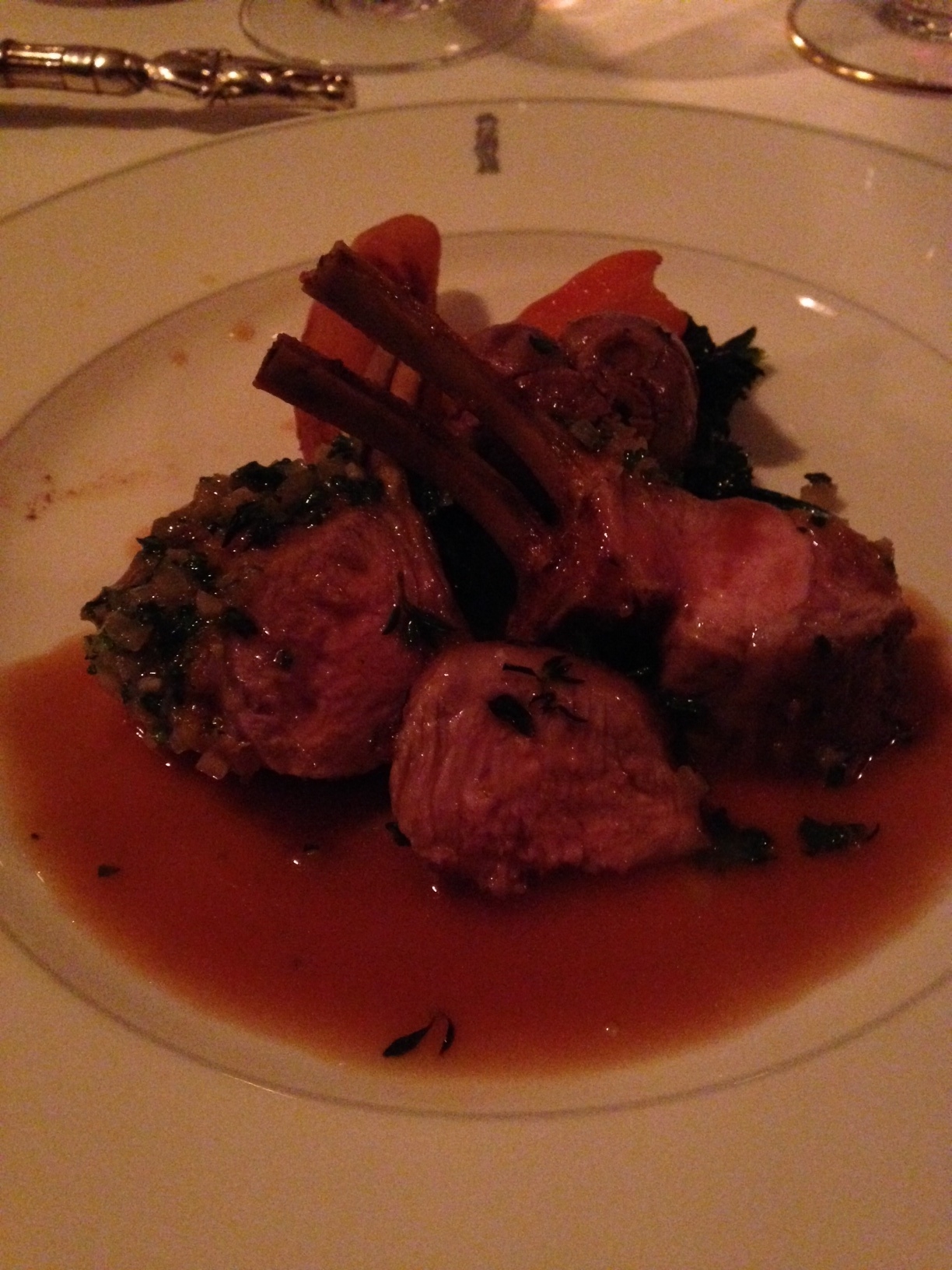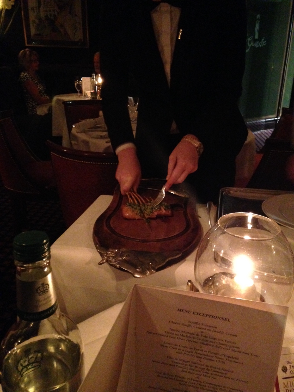 photo 8photo 9Following on from this was a Agneau de Lait Rôti en Parsillade (Roast Pyranean Lamb with Garlic and Parsley Thyme Scented Jus). This was presented with great ceremony by the waiter and then carved at our table, exceedingly opulent silver-service. The lamb was perfectly pink in the middle and the fragrances emanating from the plate were simply divine. I expected a nice Pinot to go with this course, but surprised when a rather heady “Belveze” Grand Cuvée 2007 from Château Cabezac, Minervois, Languedoc. This was a Rhone blend wine (Grenache, Syrah and Mourvèdre) and had a slightly herbal smell, which was tannic and heavy on the palate. I think I would have preferred that Pinot to be honest.