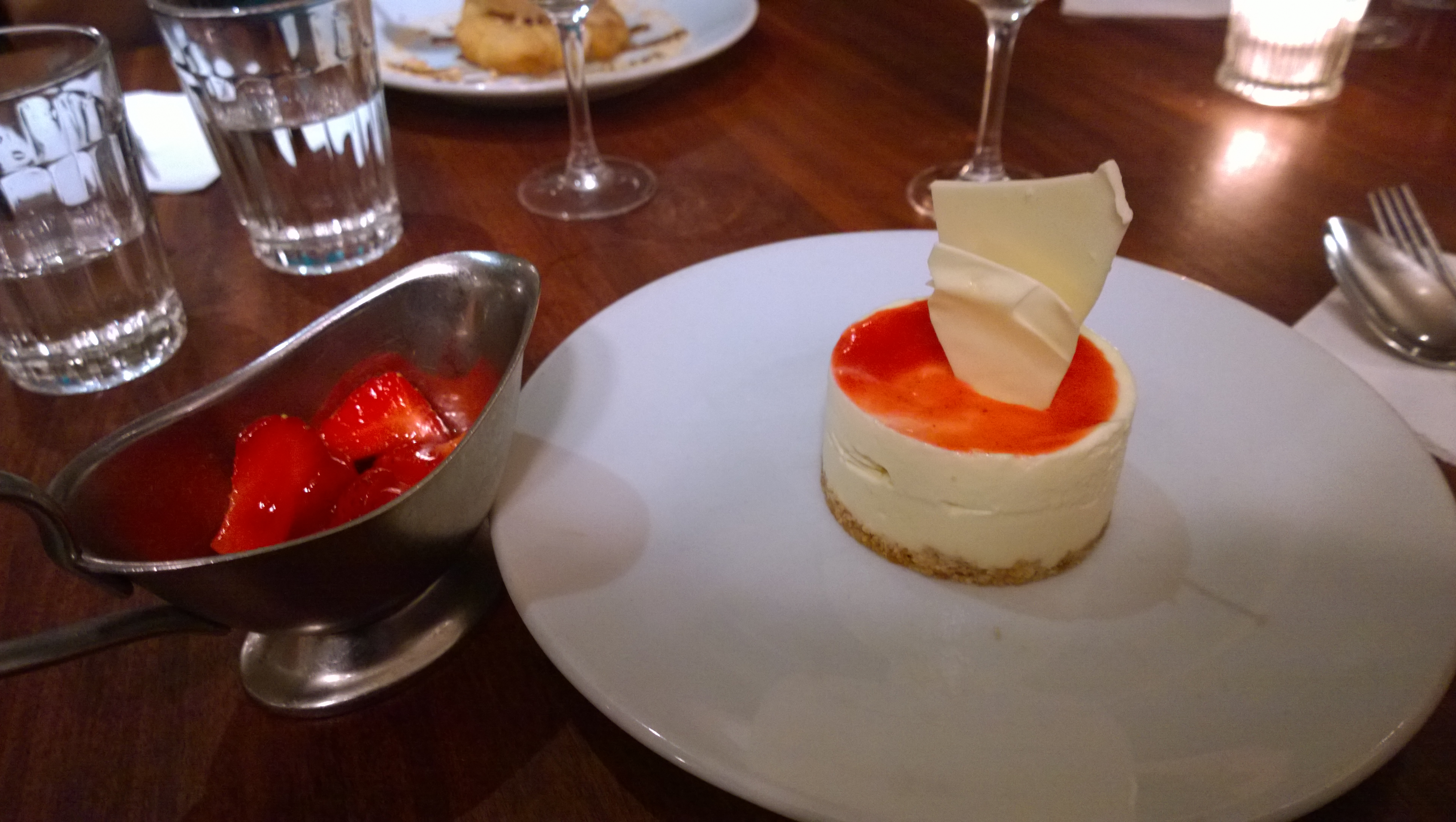 Given that we’d brought a dessert wine we needed to have a pudding. What a shame. I opted for a white chocolate cheesecake with strawberries, which was glorious. Other selections at the table included a Peanut Butter Shortbread and a Salted Caramel Ice Cream and a Sticky Toffee Pudding. A truly decadent start to a week on a Monday evening!