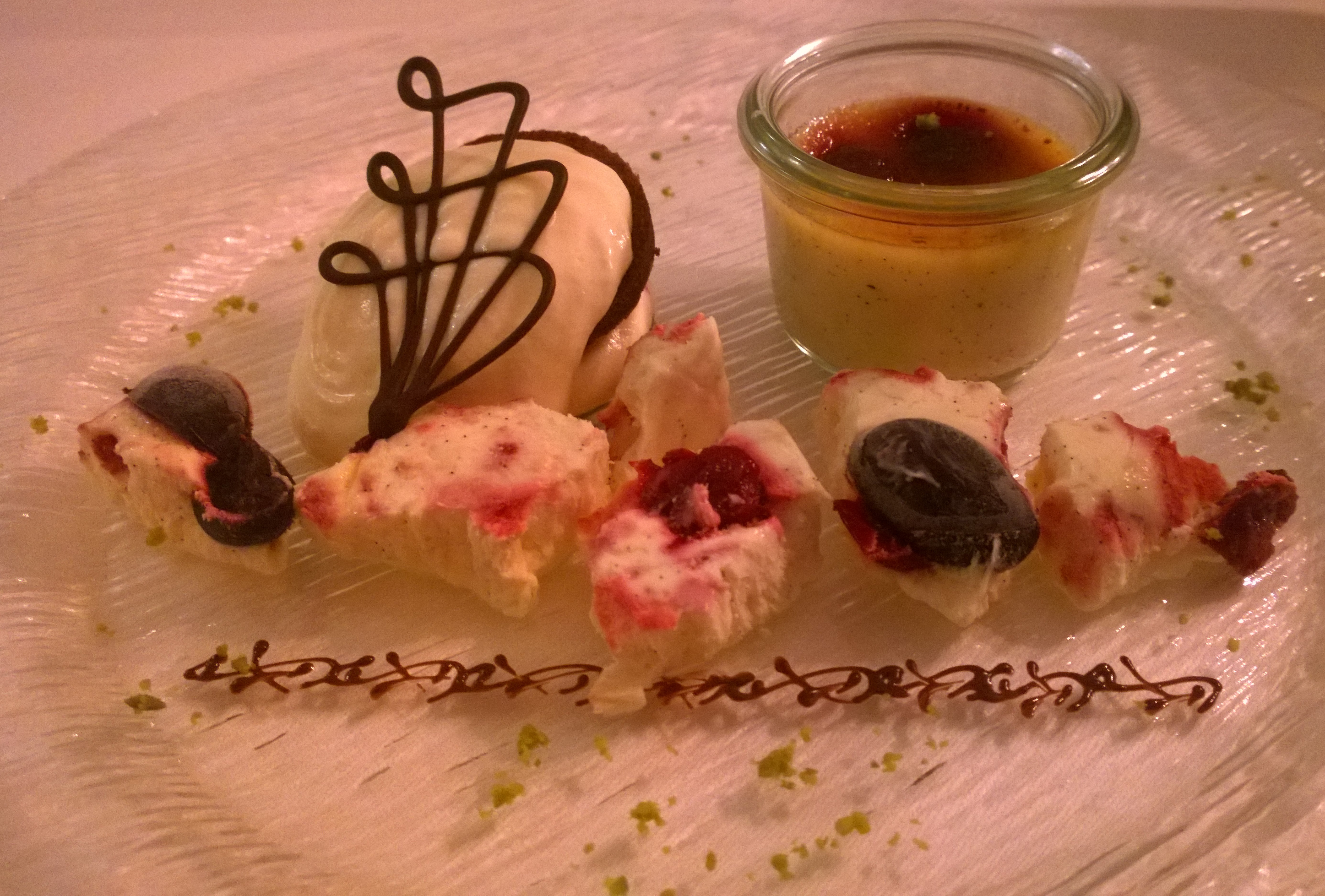 The main sweet course was the somewhat comically titled “Variations on a World Heritage Cherry Cake” (Variation von der Welterbekirsche). I asked the waitress what was meant by the title of this dish and she answered that as the Mittelrhein is a World Heritage Site, it must follow that the cherries that come from the Mittelrhein are World Heritage cherries (!) and that the restaurant was looking for a nice way to show-off these lauded cherries. When the pudding was presented to us I could see why “variations” of cherry cake was used in the title – there were various different deserts here, all featuring cherries; including a rather delicious cherry-flavoured crème brulee. The plate was put together really thoughtfully and carefully and presented in a very attractive manner.