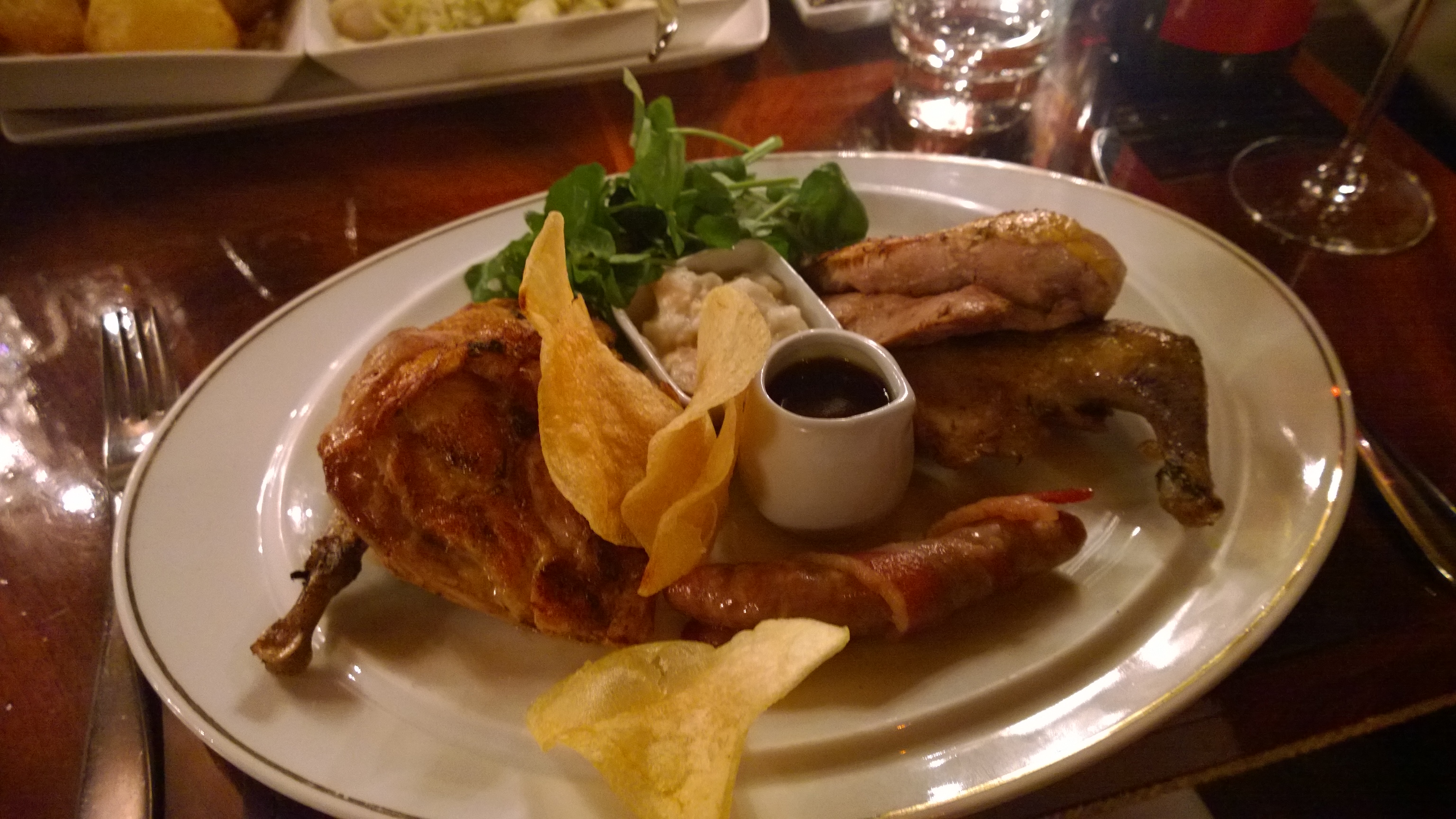 Herr Teufelskreis_20141123_16_52_02_ProFor the main course, my wife and I shared a Roasted Brace of Pheasant, basted with Rosemary and Thyme Oil, Game Chips, Pigs in Blankets, Cardamom Bread Sauce and Roasting Juices. It came with Duck Fat Roasted Maris Piper Potatoes and Sautéed Savoy Cabbage with Chilli Butter. When the platter arrived we gasped at the size of it. We had essentially a Pheasant each with two breasts and two legs for us each, plus a couple of Pigs in Blankets. Coupled with that were the generous portions of side dishes and the net result was far too much food. What really let this dish down, however, was that the Pheasant was over-cooked; it was rather tough and pretty chewy, making the whole experience of eating it somewhat of a chore. I couldn’t shake the feeling that in putting this grand platter together, they focussed on quantity and scrimped on quality. I would have been much happier with a dish half the size, but cooked better. The same could be said for the two side dishes that we got, the potatoes were not particularly nice (I cook much better roasties than that!) and the savoy cabbage was a little flavourless and textureless. All-in-all this was very underwhelming.