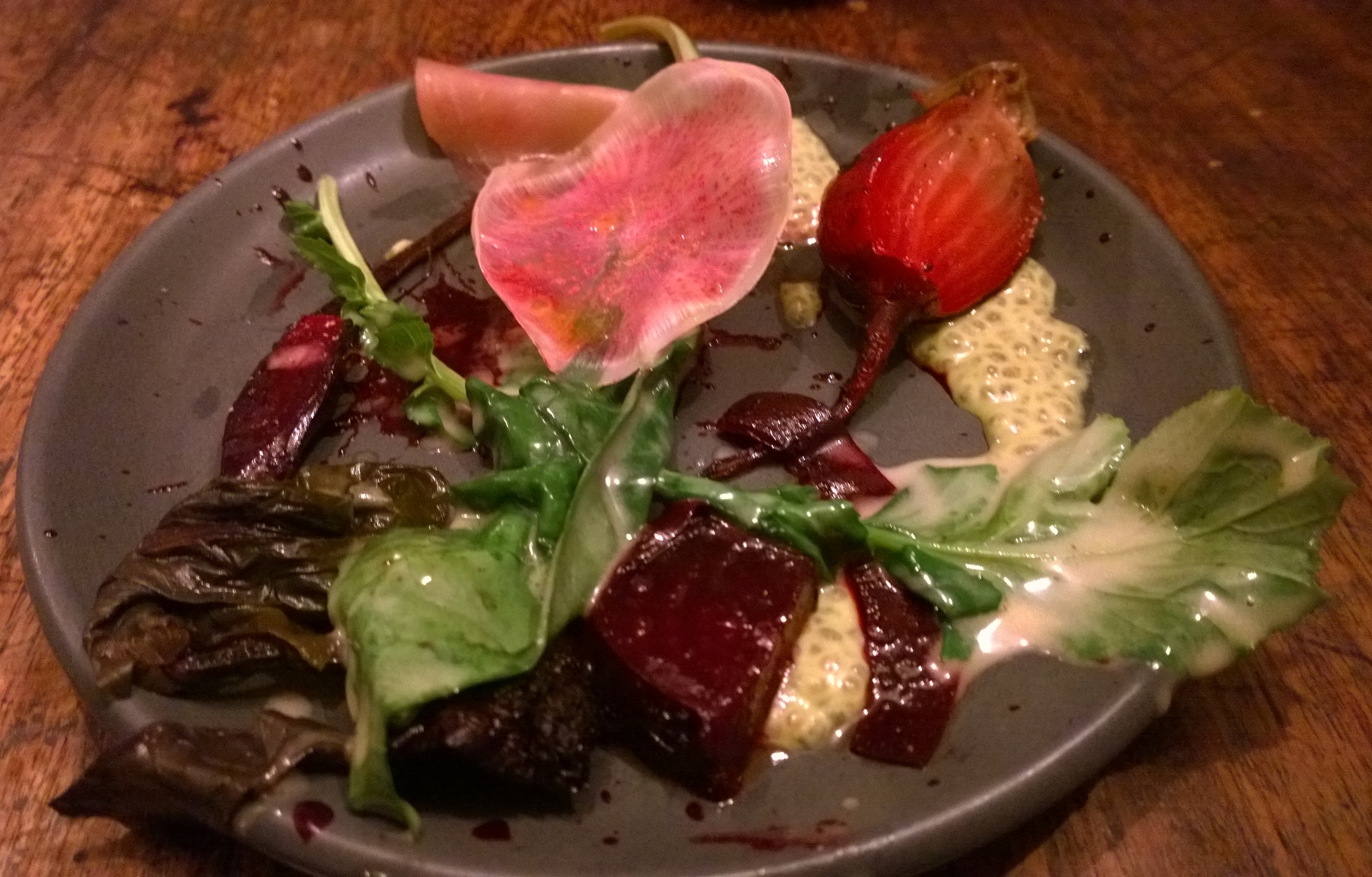 Next up was our vegetarian dish of Smoked Heritage Beetroot served with Pistachio, Chia Seeds and Buttermilk. My wife was delighted to see Chia seeds on the menu as they have been a staple in her ‘healthy eating smoothies’ for the last six months. Some may say that the plate looked a little haphazard, but I liked it. I’ve had smoked beetroot a few times now and every time I’ve liked it more and more; in this case the sweetness of the pistachio was a great match for smokey beetroot. I was given another cocktail to match this course, this one was called “Just Beet It” featuring Calvados, Amaro, Beetroot Juice and Bitters. The Calvados taste came through nicely, although I was most pleased with the match between the sours and smokey beetroot in the dish which worked tremendously well.