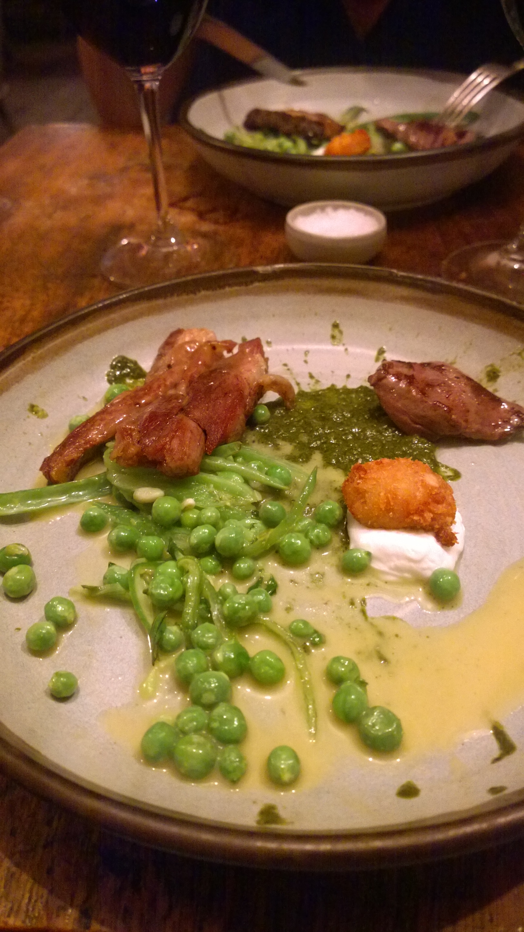 On to the meat course now and we were served with Barbecued Lamb Shoulder served with Heart, Sweetbreads, Anchovies, Peas, Runner Beans and Goats’ Curd. Once more you can see that the plating was in the “splatter” format so loved by modern chefs. This was one of those lovely plates where there were so many fantastic little morsels to discover, I was particularly enamoured with the offal which had a wonderfully intense and complex flavour and texture profile. The peas and runner beans were brilliant and fresh. I also very much liked the freshness of the goats’ curd and the saltiness of the anchovies was a delightful match with for the sweet lamb. All in all, this was a brilliant plate of food. The accompanying wine for this course was a 2013 “Sant’ Andrea” Barbera, Vigne Marina Coppi (Piedmont, Italy) which had a smokey, sweet spice and black fruit aroma. The wine was soft and supple, but it needed the food to really come alive.