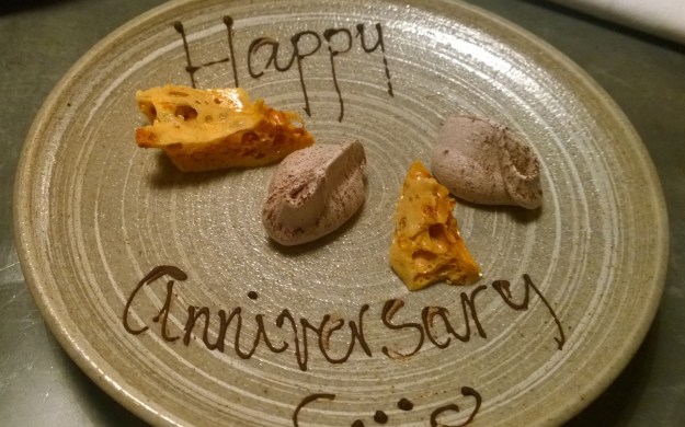 The nice folk at The Manor had one more surprise for us, which was a plate with “Happy Anniversary” written on it in chocolate and some tasty little morsels on it.