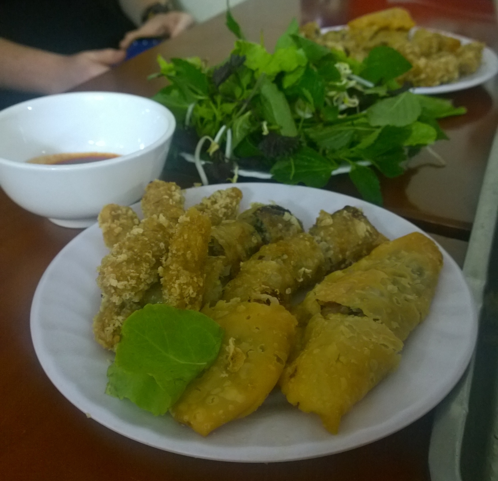 After this we were back to Nem. This time we had a selection from a famous Hanoian restaurant called Quan Goc Da (the Banyon Tree restaurant, so-called because there is a Banyon Tree growing outside of it). The selection that we had here shows the versatility of this dish; we had fried Nem with crab inside, sour Nem where the rice powder had been allowed to ferment and “pillow cakes” which were shaped somewhat like a cornish pasty and had minced pork, mushrooms and glass noodles inside. My favourite were the fried Nem, as I liked the crunch of them a lot.