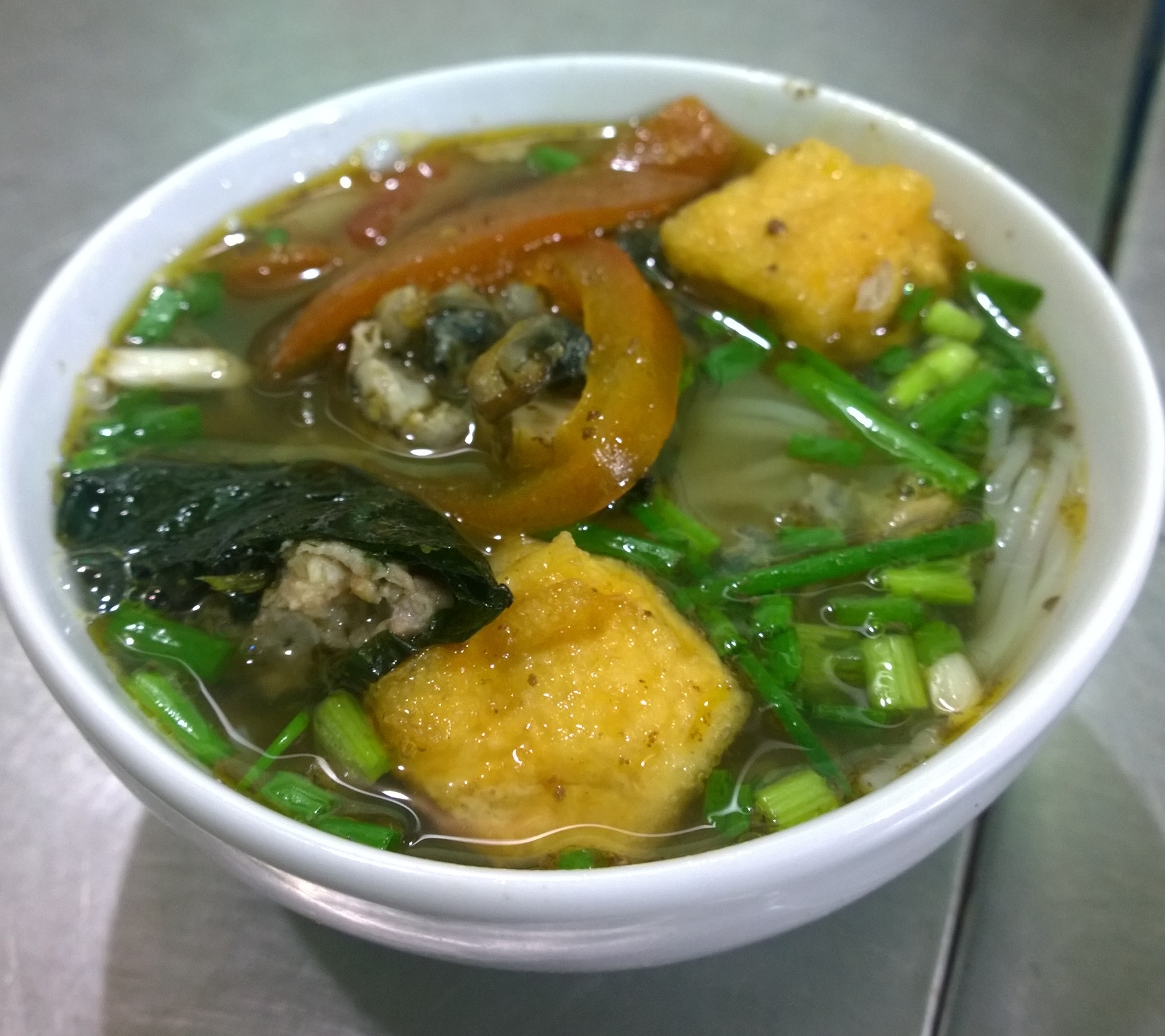 One of the more memorable dishes that we (although not all of us on the tour were brave enough…) tried was Bun Oc. “Bun” as previously was glass noodles, the “Oc” was snail. This dish was another broth (this time a sour broth, made with white wine vinegar) served with nice cubes of Tofu, tomtoes, juicy meatballs and plenty of snails. There were many little snails in this dish, which were very nice, but is also featured one simply gargantuan snail which took me about five minutes to chew! It was the size of an oyster and probably with hindsight I should have just swallowed rather than trying to chew it…