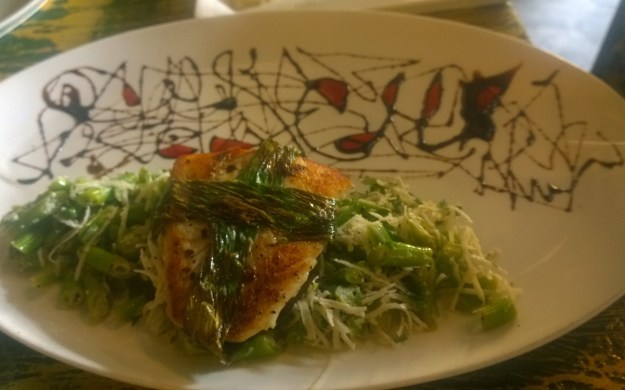 Turmeric Leaf Pan Roasted Seabass: served on a bed of long-bean and coconut and with a balsamic vinaigrette. I got a little artistic and cheffy with the dressing of the plate, I like to think that this was a design inspired by Jackson Pollock…