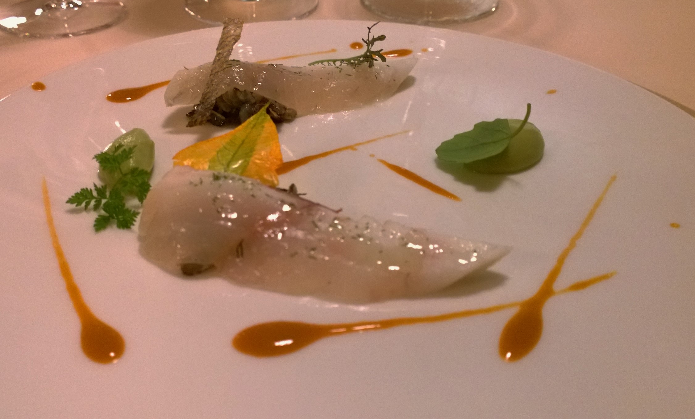 We had this with not one, but two, wines! The first was a 2012 Podere Poggio Scalette Stefano Ricci (Tuscany, Italy), which was made in a super-Tuscan style with 100% Merlot and served ex-magnum. The bottle was particularly impressive and it came with a specially-designed glass that matched the design of the bottle. The flavours emanating from the glass were all dark cherry, almost compote-like in intensity. I was surprised that this was supposed to be the match for the ravioli and found that it was quite a bit too heavy – clearly the sommelier felt otherwise! The second wine was a 2012 Domaine Ponsot Griotte Chambertin (Burgundy, France) which worked much better for me in terms of matching; it also had intense dark cherry on the nose with sandalwood sweet-spice notes, however on tasting it was much lighter than the Ricci and had juicy, plump plum flavours going on with a little more acidity, which balanced the ravioli a little better.