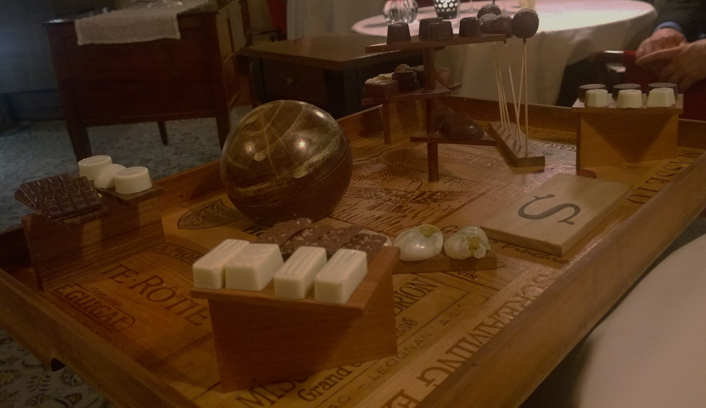 Just when we thought we were winding down, we were presented with one final surprise – the most delectable of chocolate selection trays that I have ever seen! As you will see from the picture, this was like something from Charlie and the Chocolate Factory. There were so many beautiful little morsels that you can select from, but the most fun was the chocolate orb which my wife was given the honour of breaking into. This was nice contrast after all the serious business of the high-end food and wine, it took us back to that “kid in the sweetshop” sensation, getting us all giddy with excitement about our food.