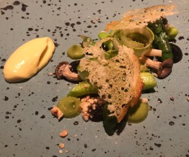 We started with Asparagus, Mushroom Ketchup, Shimeji and Hazelnut. Immediately we could see that this was a nicely crafted plate of food; the asparagus had just the right crunch to it that gave the dish some nice texture, particularly in contrast to the Shimeji mushrooms. There were little dots around the plate of a rich and deep mushroom ketchup; but I also really enjoyed the little crunches of hazelnut which gave the plate additional textural and flavour elements. Quite simply done, but well-thought out and constructed, a great start! This was served with a 2016 Tornatore Etna Bianco (made from Carricante and Cataratto grapes), which had a light and lovely citrus nose with a little bit of steeliness of stone fruit to even it out. On the palate it was nice and taut, with great balance; dominant flavours of fresh lemons. A decent match with the food.