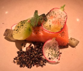 Next up was a fish dish, Atlantic Salmon served with Cucumber, Radish and Smoked Buttermilk. You can see from the picture that this was another extremely attractive plate of food; the water-bath cooking of the salmon had allowed it to retain a really pleasing pink colour, which gave it a great visual contrast to the pickled vegetables. There was also a little smattering of grains on the plate, which were very welcome as a textural addition. The smokiness in the buttermilk came through really nicely and gave an extra dimension to the dish, which I really enjoyed. This was served with a 2016 Weingut Richter Riesling (Mosel), which had the most incredibly expressive nose with bags of tropical fruit notes, but also a curious aroma that reminded me of pear drops. On the mouth this was pleasingly off-dry, with a flavour profile of ripe and juicy Seville oranges. The slightly sweet element to this wine was a great foil for the fish as it held up well against some of the more acidic elements of the dish.