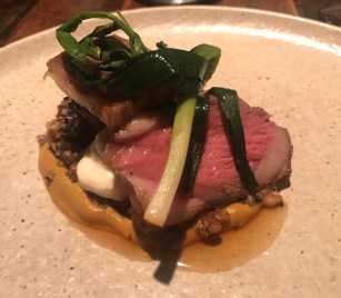 Given so much of Australia is by the coast, it was no surprise that we were then given another fish dish! This time a fillet of Humpty Doo Barramundi served with Shallot Puree, Smoked Eel and Pickled Kohlrabi. Whereas the last dish was quite dainty and elegant, this was a much more weighty and meaty take on a fish dish. The Barramundi fillet was quite firm and had a real presence; this was augmented by the fact that the skin had been cooked using a blowtorch to give it a nice crispiness (we were at St Crispin, after all… *groan*). However, this dish was still a very cleverly put together dish with lots of nice morsels to discover as you worked your way around the plate – for example, the little nuggets of smoked eel on the plate were sublime and the pickled sea vegetables reminded one that this was a dish celebrating the bounty of the sea. The wine match for this course was a 2016 Unico Zelo Fiano (Clare Valley); I was pleased as this was our first Australian wine of the evening! The nose was all buttery and nutty like a pleasingly-oaked Chardonnay, with a slightly waxy quality to it. On tasting it had a decent weight to the wine, which really helped it to stand up well against the complex flavours and textures from the dish.