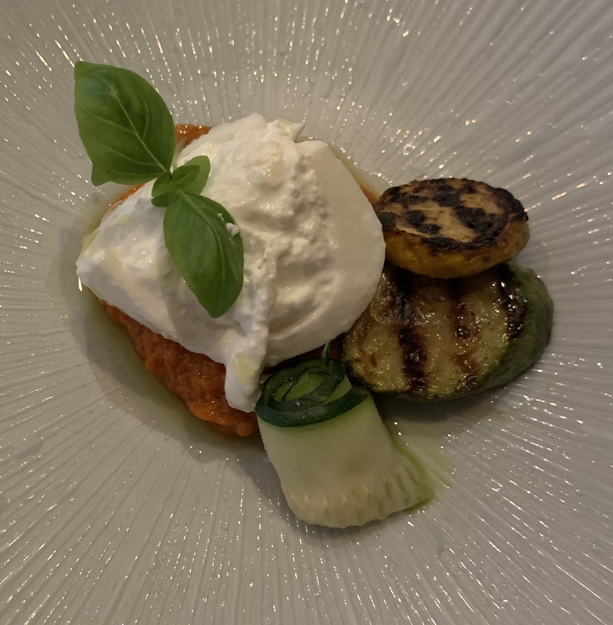 The meal started with burrata served with romesco, courgette and basil. Any dish that features burrata will always be a winner for me – I absolutely adore that creamy, melty, slightly salty, oozy, orb of deliciousness. This was no exception – and it paired wonderfully with the chargrilled yellow and green courgettes (very much in season now, as my recent forays into gardening have shown me!). Underneath the burrata was a romesco, which is a Catalan sauce made from tomatoes, olive oil, garlic and various nuts (thank you Wikipedia!). I thought it had a kind of tapenade consistency to it. The flavours were very pronounced and gave a lovely lift to this Mediterranean-inspired dish. I also liked the dramatic plate that this was served on, it kind of reminded me of a glamorous sea-shell.