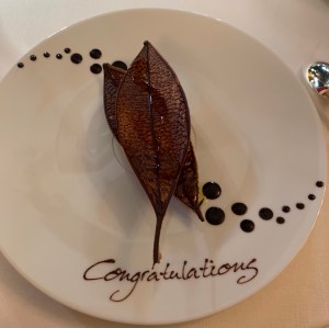 For the dessert, I went for a Champsoleil Olive Oil served with Local Orange Blossom Water Crémeaux and Fine Leaves of Venezuelan Chocolate. I was really intrigued by what looked like a very savoury sweet course. As you’ll see from the photo, the dish was once again presented absolutely beautifully – and I was very glad that I chose this dessert from the menu (there was a choice between a rhubarb dessert, which Isabelle opted for). The leaf itself was as delicate as could be – the waiter admitted that the break more of these than they successfully plate! – but it had a wonderful richness to it. The olive oil and orange scented water were absolutely genius as they gave a beautiful floral and fruity lilt, whilst also having a richness to it, giving the dish some depth. The little congratulatory message from the kitchen was another lovely touch.
