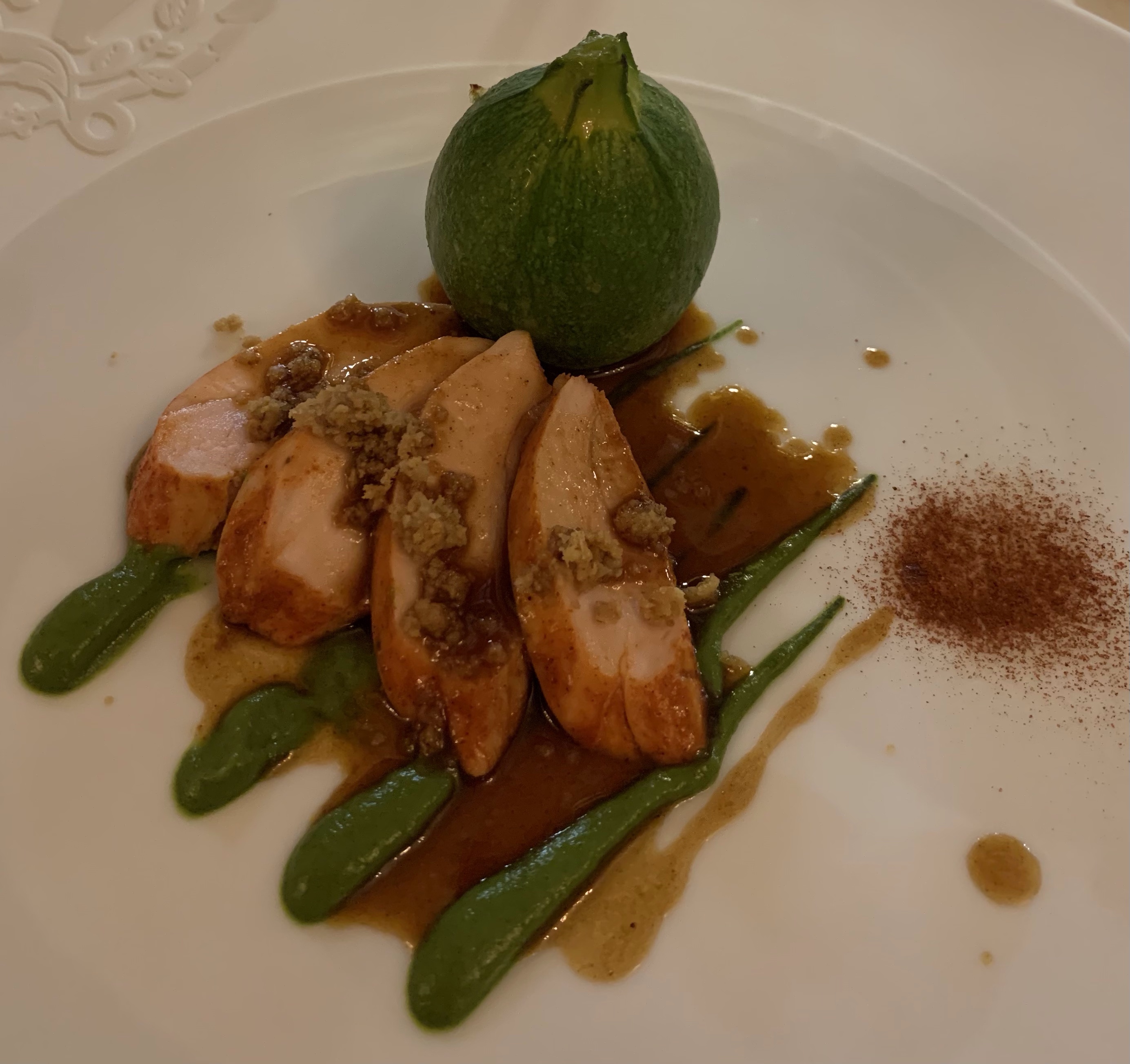 Our last savoury dish was the Local Organic Poultry “Terre de Toine” served with Steamed Camargue Rice, Tandoori and Stuffed Zucchini. We were presented with the dish which had been baked inside a pastry crust on a bed of rice and prepared with tandoori spices. Now, in the UK we are very familiar with tandoori spices and I feel that as a result the effect here they were looking for as something a bit exotic and different didn’t quite translate. However, the dish itself was very clever and well-constructed. The chicken was beautifully cooked and the spices gave it a nice lift. Cleverly, the chefs had included the chicken skin which had crisped up nicely on top of the chicken to give it extra texture. The stuffed courgette flower was also filled with some of the chicken flesh and chicken skin, which worked very well. I really liked the plate and thought it was cleverly done, even if the result wasn’t quite the novel sensation that they were hoping for.