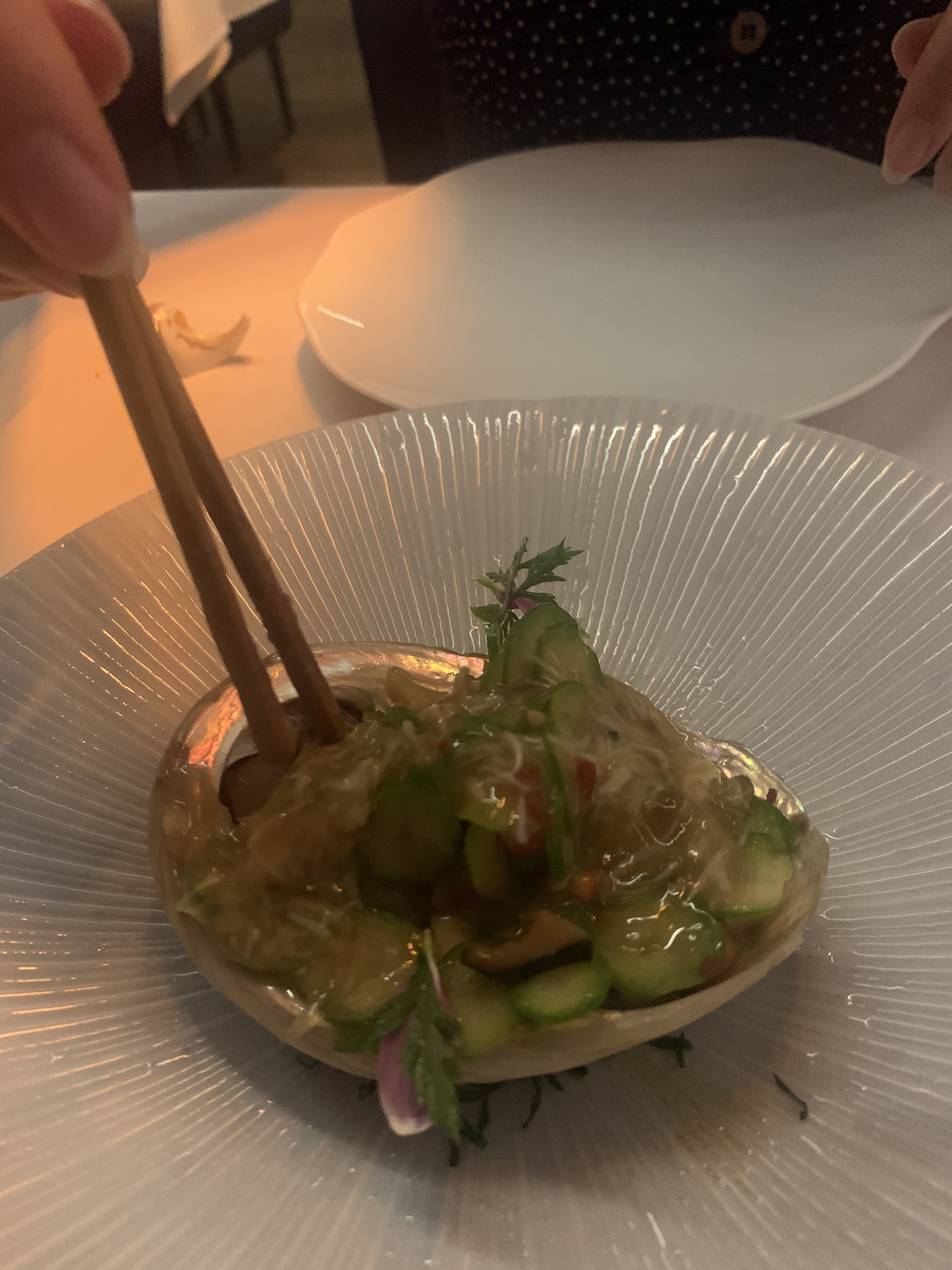 Next up was a real stand out dish for me – “Braised Abalone, Shitake Mushroom, Sea Cucumber and Abalone Butter”, which is also given the moniker ‘Why we don’t need to eat shark’s fin soup’. Shark fin soup is one of the more notorious dishes in Chinese cuisine, it is a delicacy which requires the hunting of sharks for their eponymous fin as a key ingredient – a practice widely criticised around the world, and rightly so, as it has significantly impacted on the shark population. We were told that chef Wong wanted to create an alternative dish, sourced with more responsible ingredients. He seized on the use of abalone – a sea snail with an attractive shell. I can’t pretend to explain the process for how he created this dish, evidently a lot of time and effort has gone into researching this; I also can’t claim that I can comment on authenticity versus real shark fin. However, the result of what we were presented was something that was absolutely delicious, the ’soup’ was so thick, unctuous and flavoursome and the combination with the sea cucumber and shitake mushrooms was wonderful. This was a dish that is more than just a dish, it is social commentary combined with a focus on environmental sustainability.
