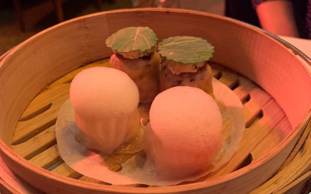 The menu was grouped into a number of movements (something that as a classical music fan I quite enjoyed!) and we started with a selection of wonderful morsels and interesting flavour combinations (you can see the photos of these above). The most impressive visually was the Zhou dynasty cured scallop, stuffed crab claw and wasabi – it reminded me (asethtically at least) of a sea anemone (photo to the far left). The ’Dim Sum duo’ (far were supposed to represent the king and queen of dim-sum that fabulous street food that is so easy and so delicious to eat, but looks fiendishly difficult to make. I also very much enjoyed the Barbequed Pork Jerky served with Char Sui (roast pork) and Grated Foie Gras. The depth of the flavours on the barbequed pork was wonderful and who hasn’t wanted to try a frozen, grated foie gras to complement the rich and sticky sauce of the jerky? This was so clever and absolutely delicious. We moved to Shanghai for a different king of dumpling now – a steamed dumpling with ginger infused vinegar.