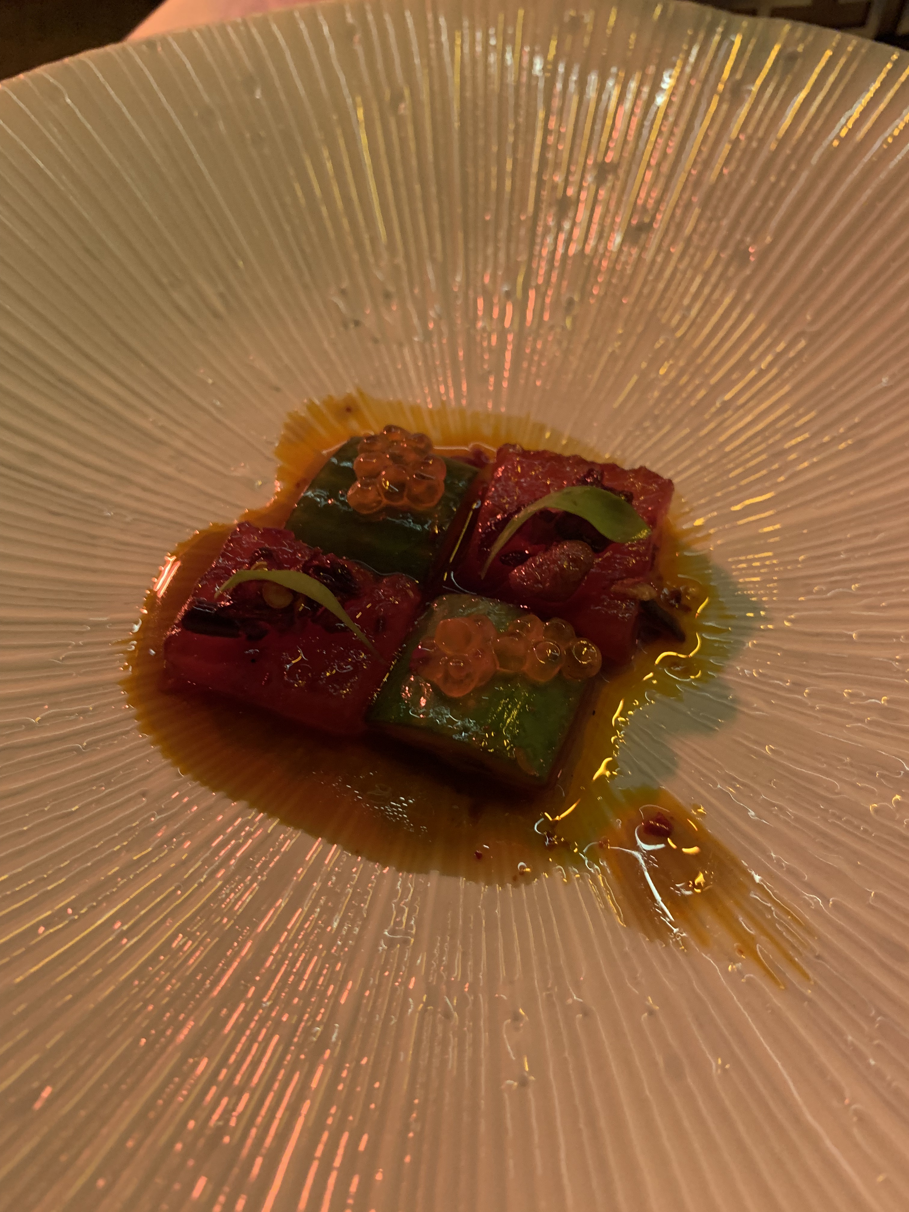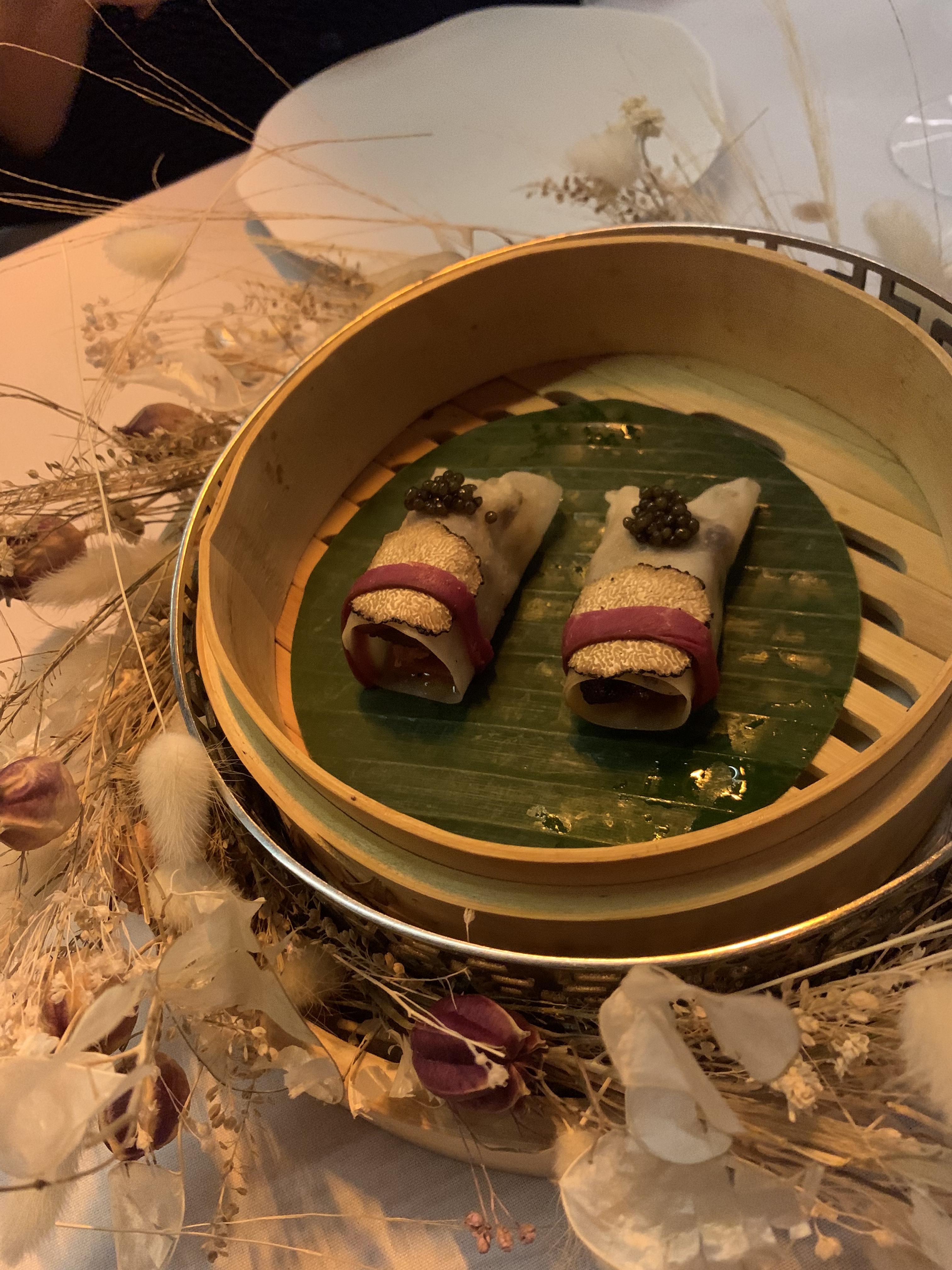 Keeping the menu going now and on to the next round of dishes: a basket arrived and we were told that this represented a dish enigmatically called ‘Memories of Peking Duck’. The basket itself was beautifully presented and as the lid was lifted a beautiful fragrance was emitted as the steam escaped. This was just perfection, a re-engineering of a dish that I felt couldn’t be enhanced – the use of a grating of truffle and some tapioca pearls on top of the beautifully cooked duck was just wonderful.