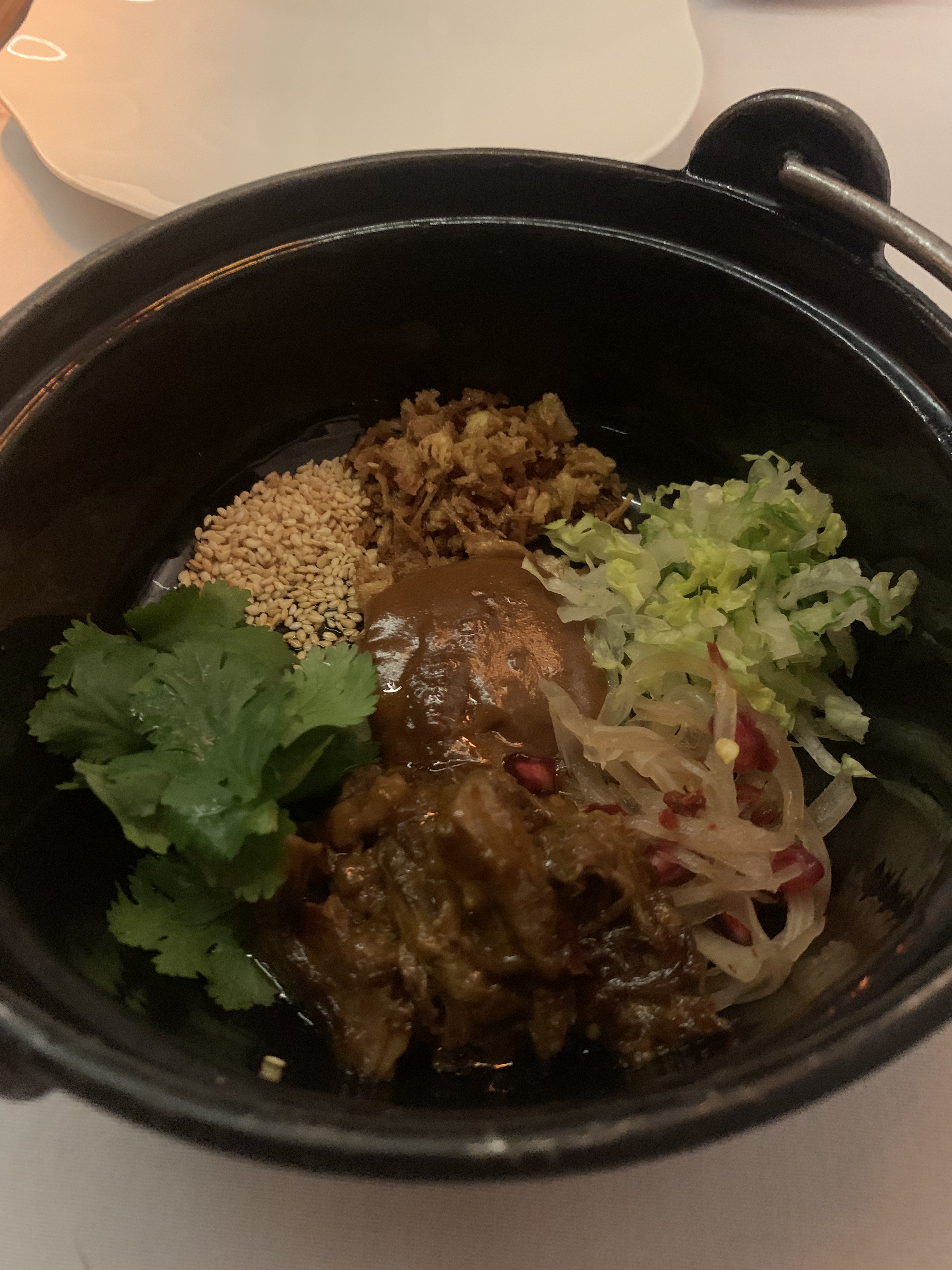 We were then presented with another couple of regional dishes – a “Shaanxi Pulled Lamb ‘Burger’ with Xinjiang Pomegranate Salad”, alongside a “Yunnan Seared Beef with Mint, Chilli and Lemongrass, served with a Pulled Noodle Cracker”. The first dish was a kind of DIY lamb burger bun with loads of wonderful flavours, complemented by a freshness from the herbs – an absolute winner. Even better though, was the beef – I really appreciated the extra spiciness that this dish had, which is apparently a hallmark of food from the Yunnan province in SW China.