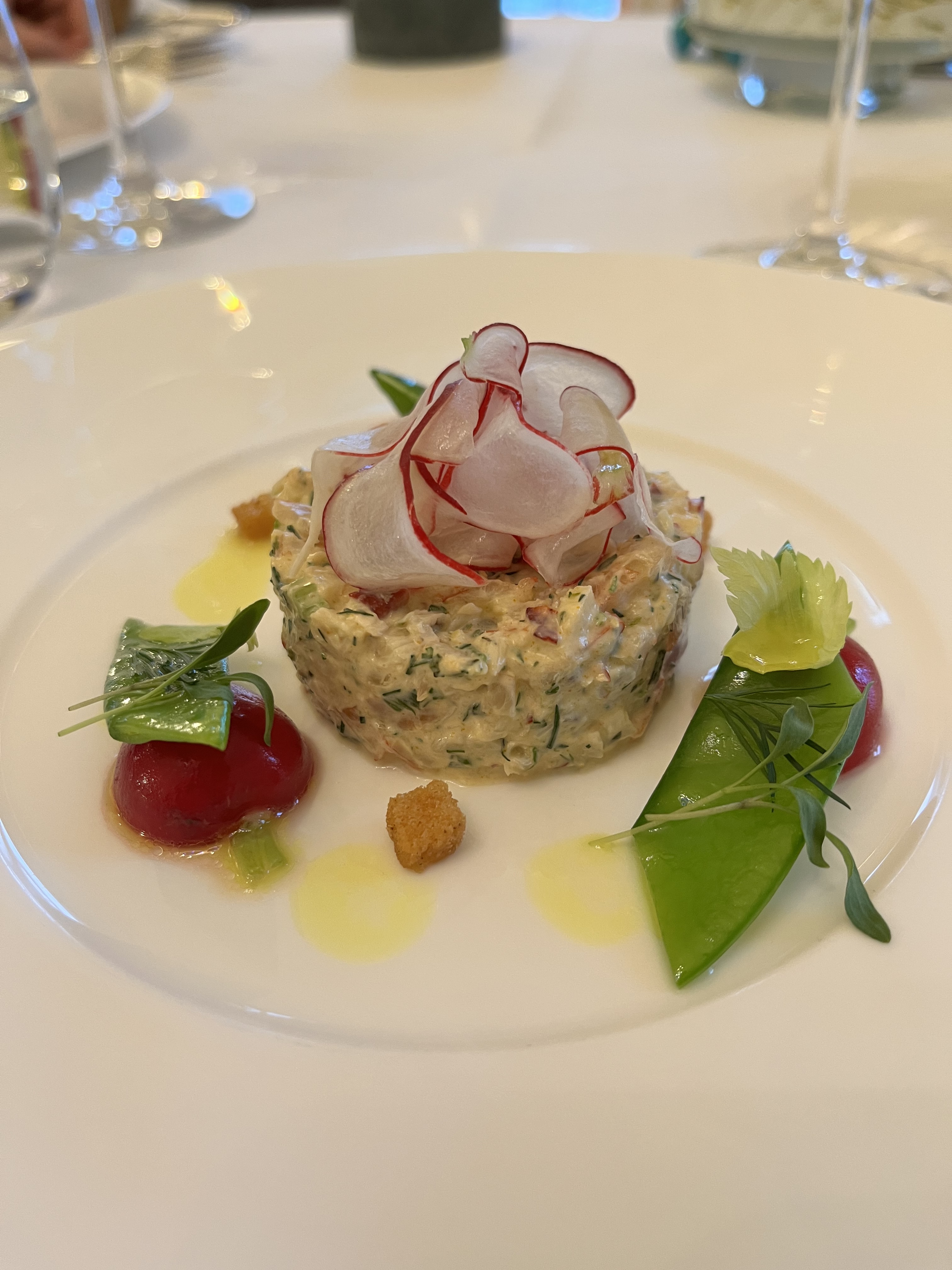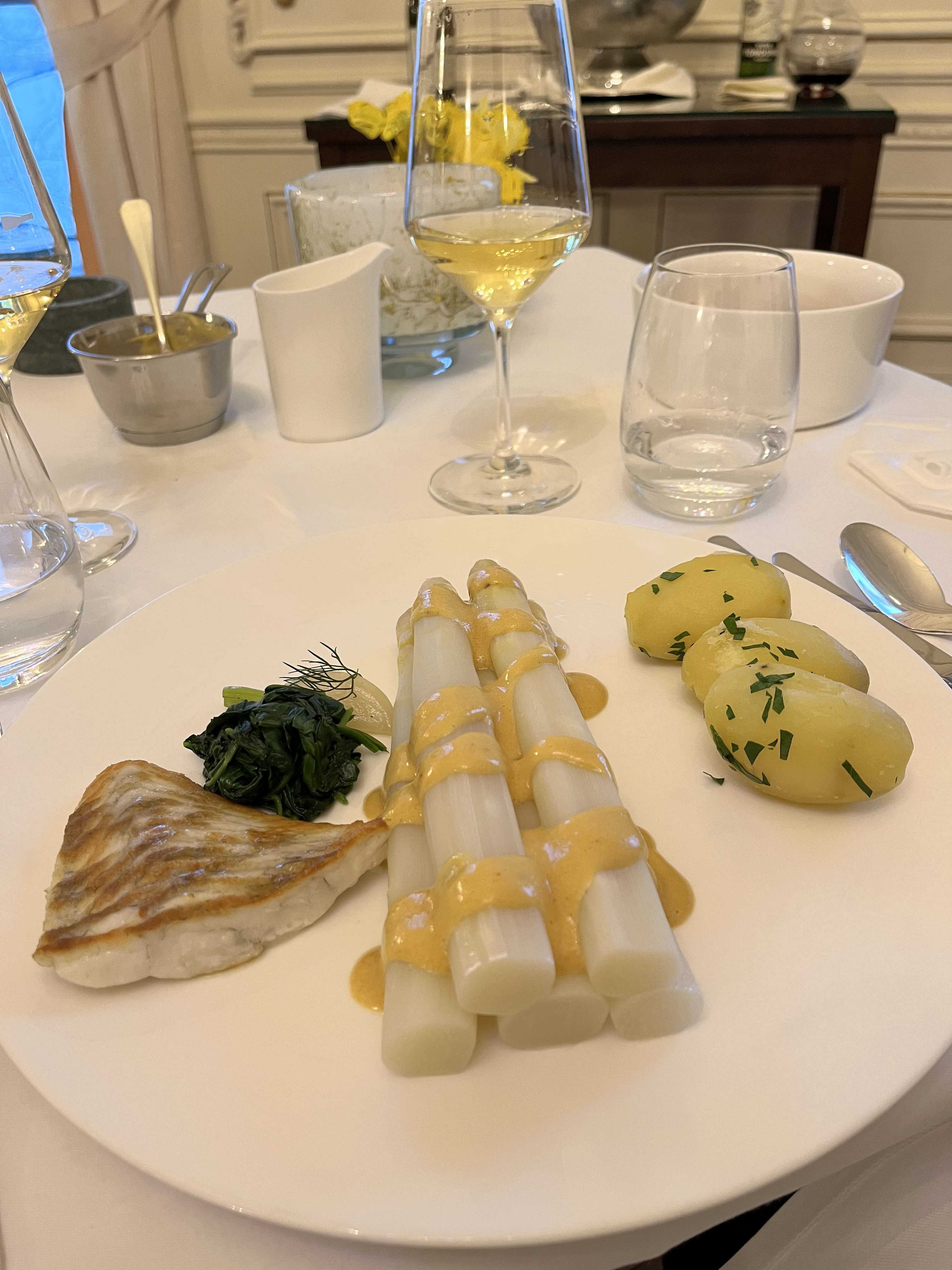 Nowadays, the hotel retains its status and prestige. It still has its terrace, where you can luxuriate in the summer – when the notoriously temperamental Hamburg weather allows it… It has a main restaurant where its residents generally eat, but it also has a small fine-dining room where head chef Thomas Martin offers a tasting menu. Chef Martin is a German culinary star – up until 2020 his restaurant in Hotel Jacob held two Michelin stars. The dining room is set out charmingly in a very classical style – with tables affording nice views over the Elbe, although amusingly the other bank of the Elbe features an industrial-sized shipping container port – not the most salubrious of environs! The shipping containers do have a lovely view of the hotel though…