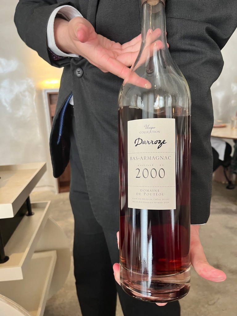 Now to dessert where there was a choice available. I went for the restaurant’s signature dessert “the Baba”. The Baba was bready and fluffy, and quite simple. The genius with it though was what it came with. Again a trolley was wheeled over, this time featuring a selection of Armagnacs made by Hélène’s brother, Marc. I was offered the choice of the 1995, 2000, and 2003 vintages; each of them had a slightly different profile. I preferred the 2000 it had some of the deeper notes on it, but still quite a lot of fruit and spice. It was then poured liberally over the Baba which soaked it beautifully with the fluffy pudding drinking it up. Alongside the boozy Baba there was a rich quenelle of Madagascan vanilla chantilly cream, alongside a Kiwi sorbet, which was served with a fennel vinaigrette and toasted fennel seeds. This added a temperature contrast to the dish, but also gave a little bit of acidic tang to the overall plate. A quite simply magnificent plate.